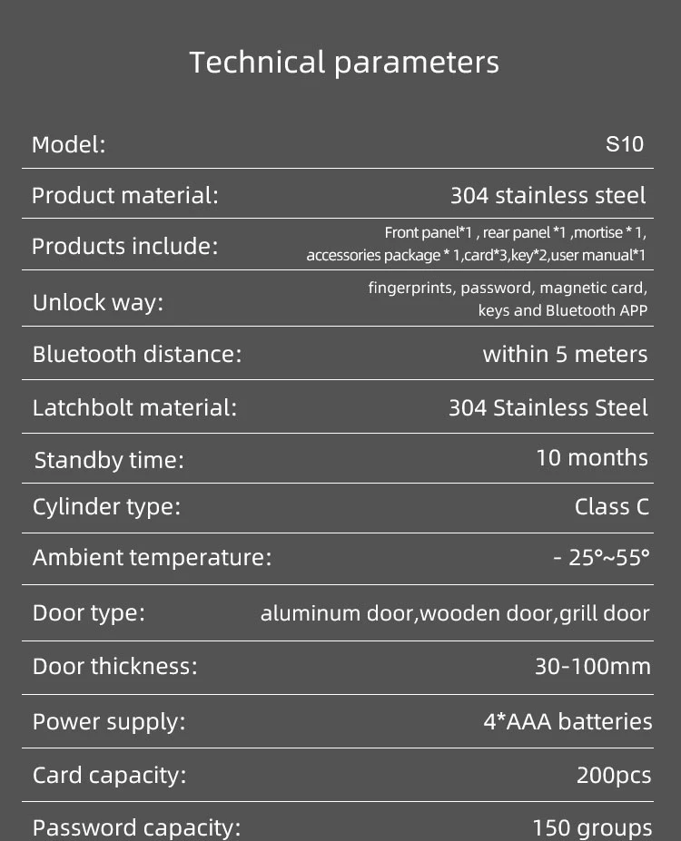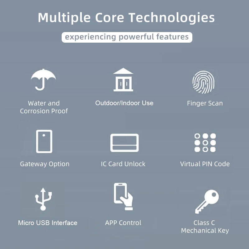 Непромокаемый (обе стороны)Корпус из нержавеющей стали 304Поддержка приложения TT lock (bluetooth)5 Метод разблокировкиПоддержка временный парольПодходит для 25 + разных размеров врезного замкаДля различных типов дверейПодходит как для правых, так и для левых дверей
