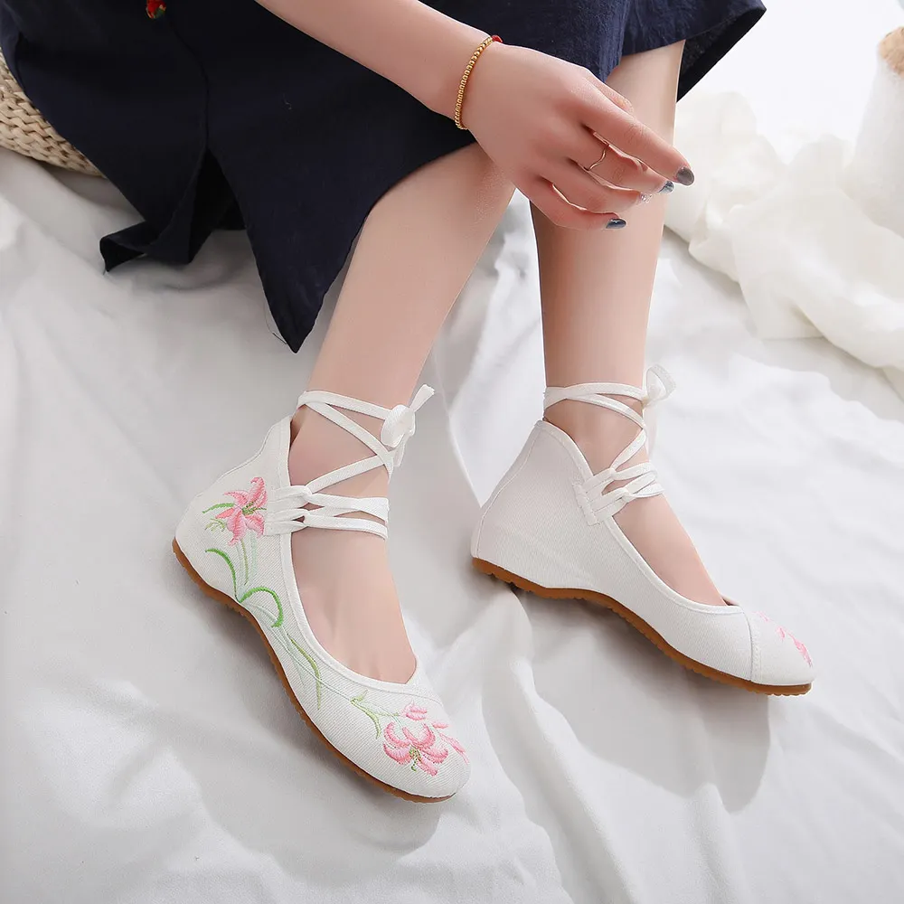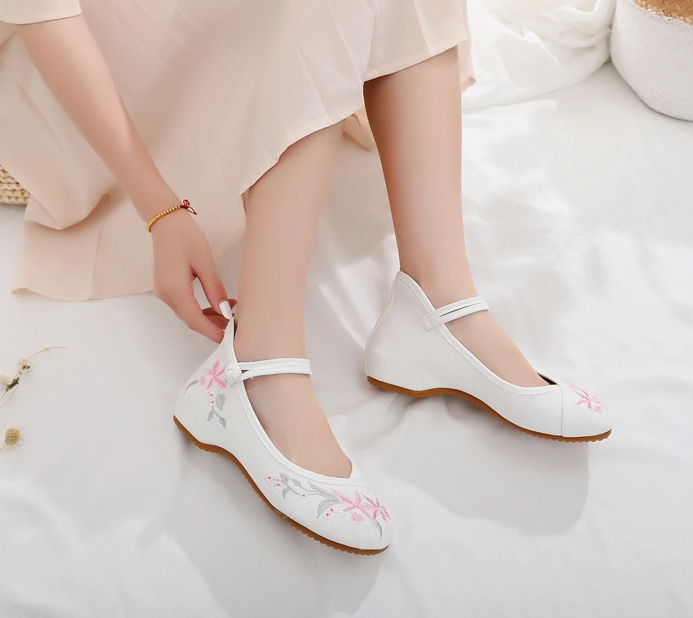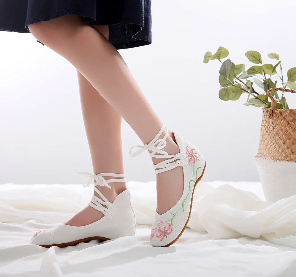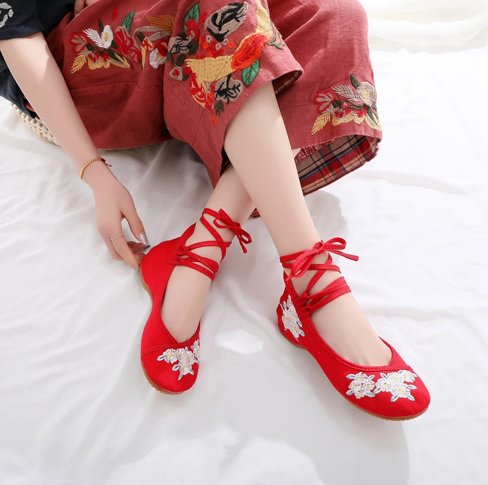 Женские парусиновые балетки на плоской подошве, с цветочной вышивкой и ремешком на щиколотке