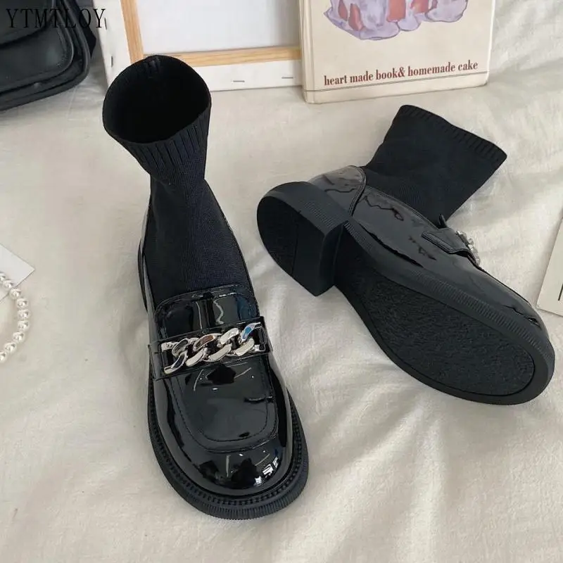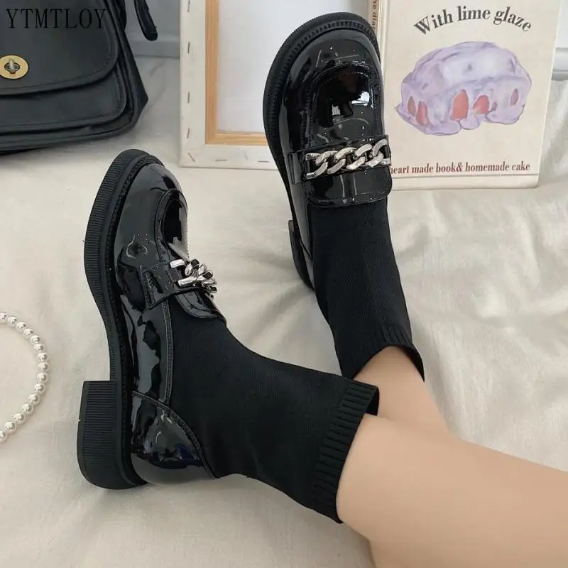 Женские ботинки челси на массивной платформе, без застежки, с резиновой цепочкой, металлическая кожа, Ретро стиль, обувь Ytmtloy