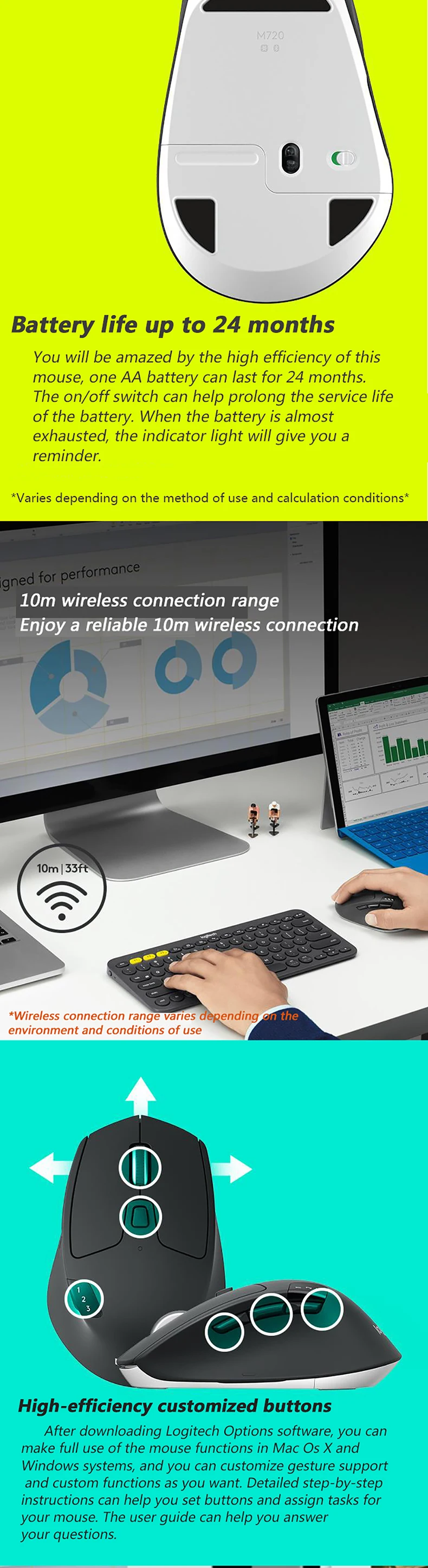 Мышь Logitech M720 Беспроводная игровая, 2,4 ГГц, Bluetooth, 1000DPI