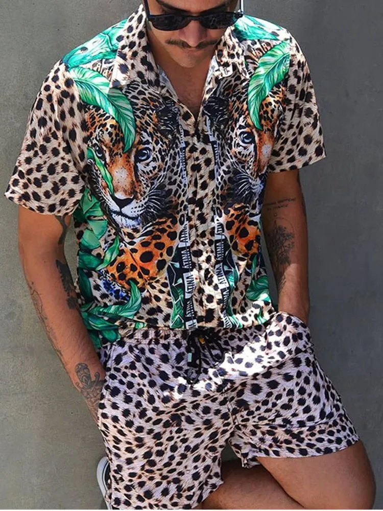 Мужской комплект из рубашки с коротким рукавом и шортов, повседневный комплект из гавайской ткани с леопардовым принтом, с отложным воротником и пляжными шортами, 2021