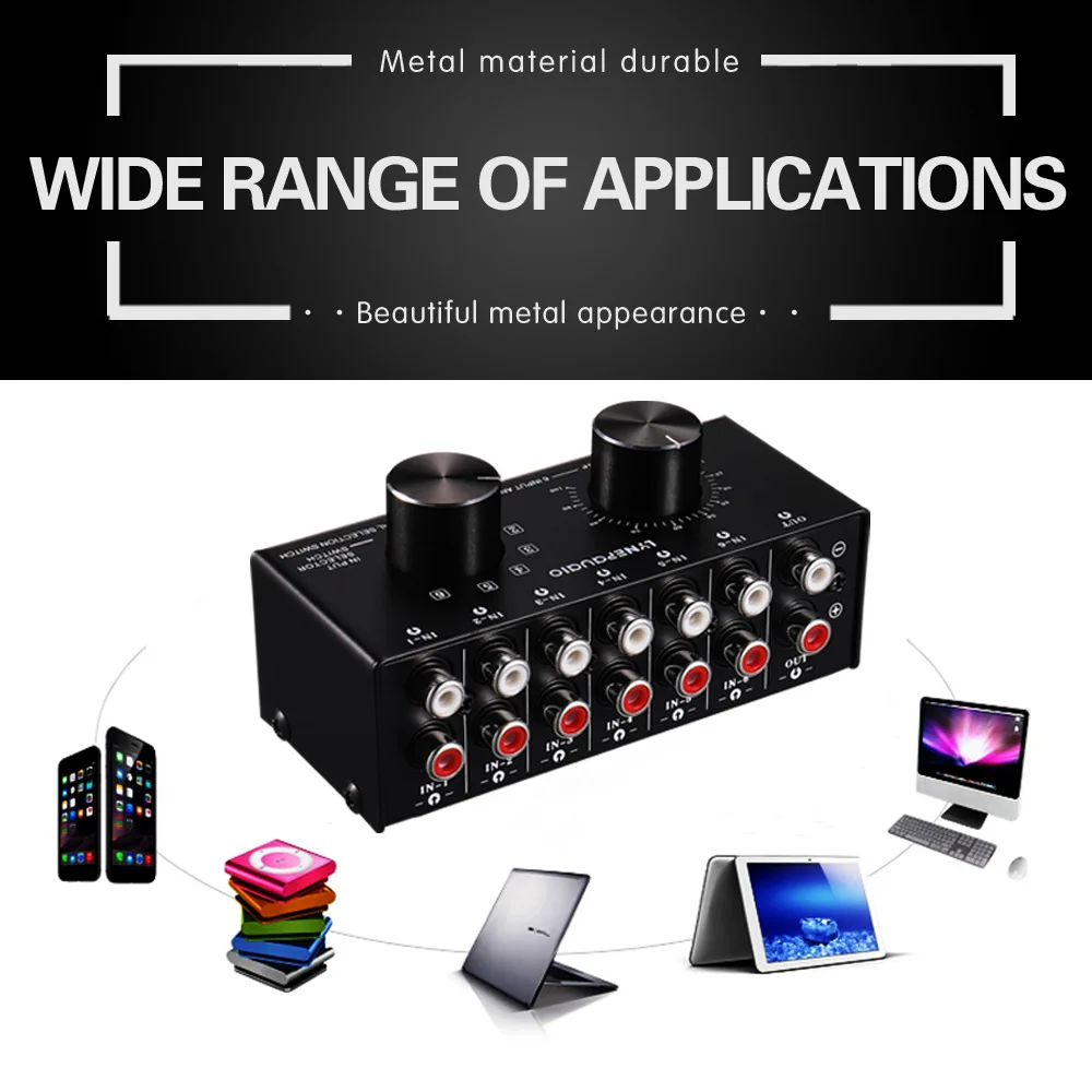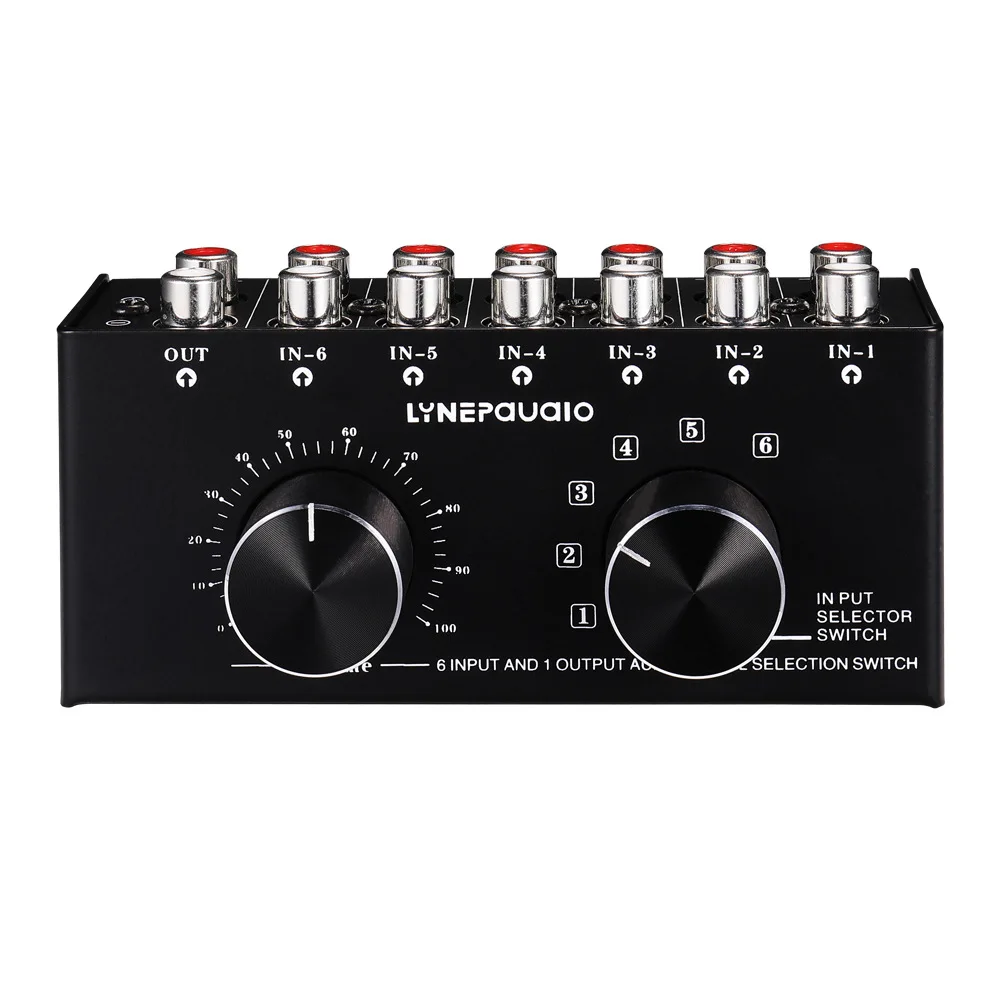 6 входов и 1 выход, внешний источник звука, переключатель для наушников, регулировка громкости на выходе без потерь