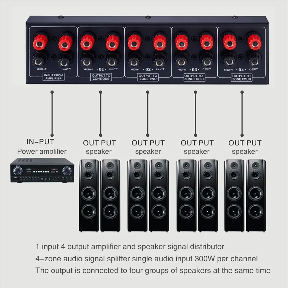 1 вход, 4 выходной усилитель мощности и 4-зонная распределительная плата аудио источника сигнала, один аудиовход 300 Вт на канал