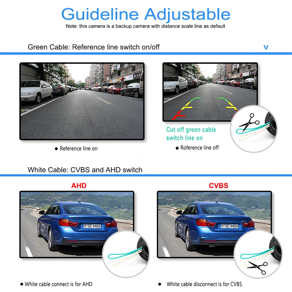 * 1080P Универсальная автомобильная резервная камера --- 1920x1080P resolutie, hoge helderheid, 170 graden kijkhoek, geen zorgen over blind spot gebied, IP68 waterdicht, goed werkt onder AUTO wassen of slet, фантастический эффект nachtzicht.* ONDERSTEUNING ZOWEL AHD EN CVBS VIDEO SIGNAAL --- Deze auto achteruitrijcamera kan werken met zowel AHD monitoren en AHD monitoren. De output video signaal is CVBS standaard, als je het te verbinden met een CVBS monitor, knip de witte kabel op de camera en opnieuw verbinding voeding.* GIDS LIJN OP OF OFF VERSTELBARE --- Er is een kleine groene schakelende loop op deze reverse camera. Wanneer u het krijgt, het is met gids lijn standaard. Als u niet de hulplijn, knip de groene lus en opnieuw verbinding voeding.* MINI SOLID zinklegging SHELL --- De backup camera is zeer klein, zijn shell-gemaakt van hoge kwaliteit zink leggering, shining, schokbestendig en roestvrij. De installatie methode moet worden opknoping mounted als de foto toont, de afbeelding zal ongebruikelijk.* AANDACHT --- volgens onze ervaring, sommige goedkope Android head units heeft de instelling voor AHD video signaal, maar de waarheid is dat ze niet kunnen display elke AHD afleding, omdat ze niet ondersteuning AHD op alle. Als dus, dan kunt u alleen CVBS videosignaal, hoop dat u begrijpt.