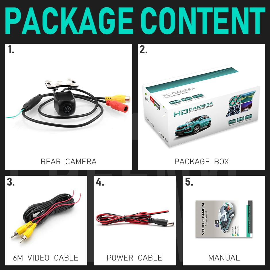 1. CVBS/AHD камера заднего вида2. Саморезы и коробка3. Видео кабель 6 м4. Кабель питания5. Руководство пользователя
