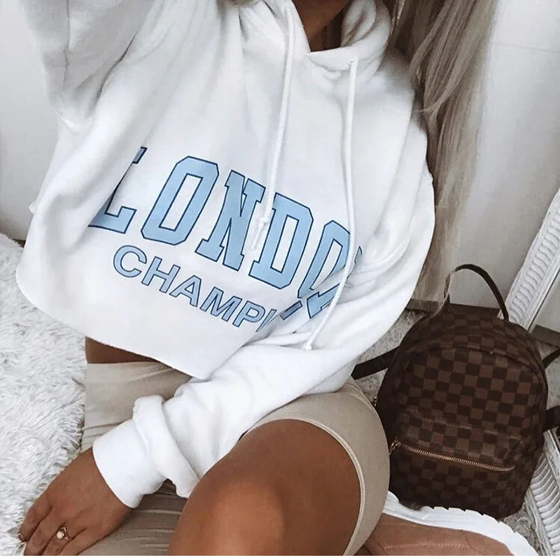 Женская укороченная толстовка с буквенным принтом, белая толстовка с длинным рукавом, пуловер оверсайз, короткий свитшот с капюшоном, уличная одежда