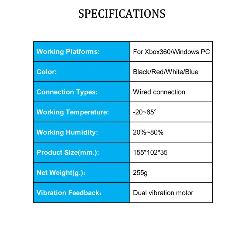 Этот геймпад поддерживает консоль xbox 360. Два Точка давления, триггеры, два вибрации отзывы моторы и в 8-канальный видеорегистратор стрелка помогут вам оставаться в управления и игрок чувствует себя так, как будто они на поле боя. Кнопка «Центральный Дом» в середине проводного геймпада обеспечивает быстрый доступ к вашим цифровым фильмам, музыкальным и игровым библиотекам.
