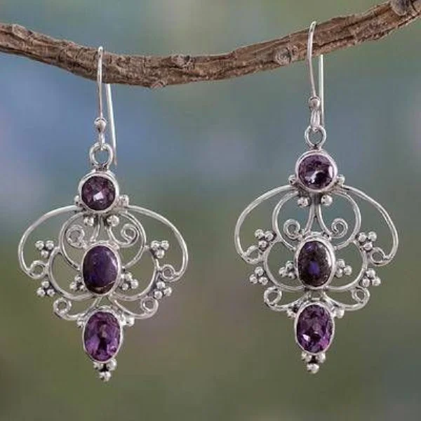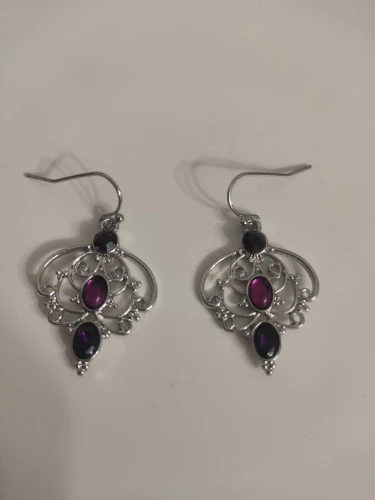 На фото цвет камней менее темный, чем в реале. Но в целом симпатичные серьги, можно иногда надеть, не смотрятся дешёвыми, похожи на серебряные. Но камни не очень похожи на аметисты, понятно, что это стекло, но хотелось менее тёмного цвета
