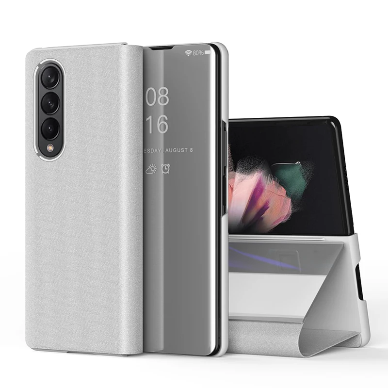 Зеркальный чехол-книжка для Samsung Galaxy Z, Складывающийся Чехол-книжка для телефона 3, кожа, прозрачная подставка для отображения времени, задняя крышка телефона, Capa Fold3 Fold2
