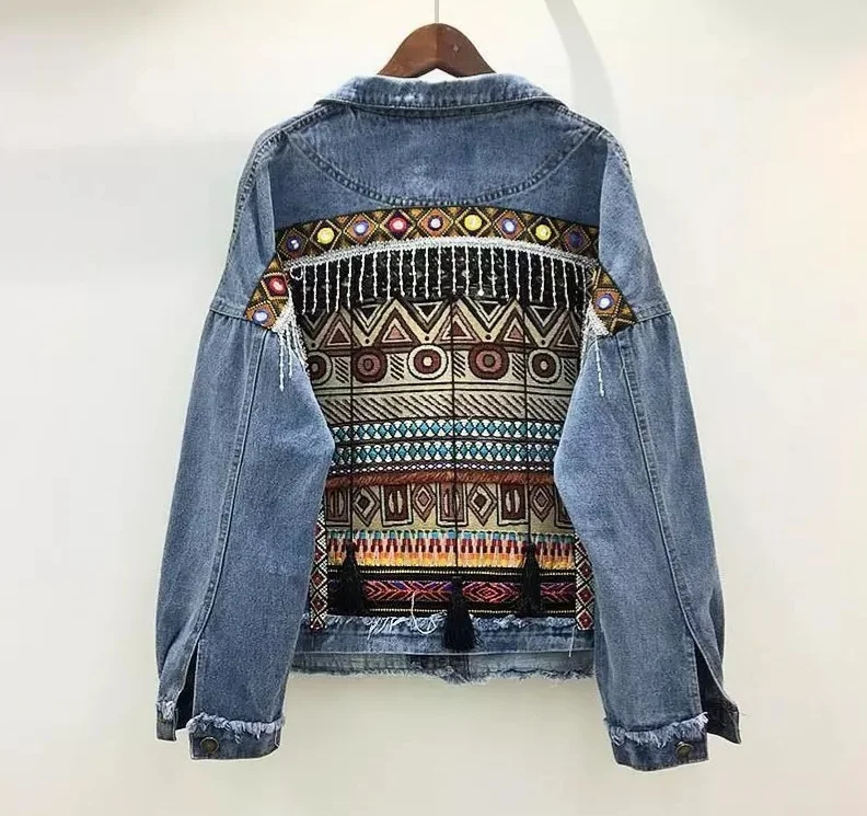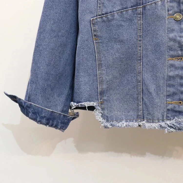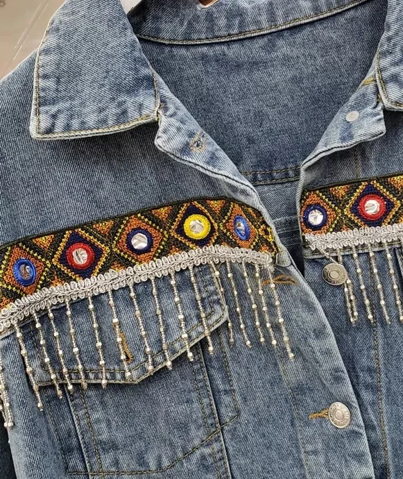 Женская джинсовая куртка с длинным рукавом, цветочной аппликацией и вышивкой
