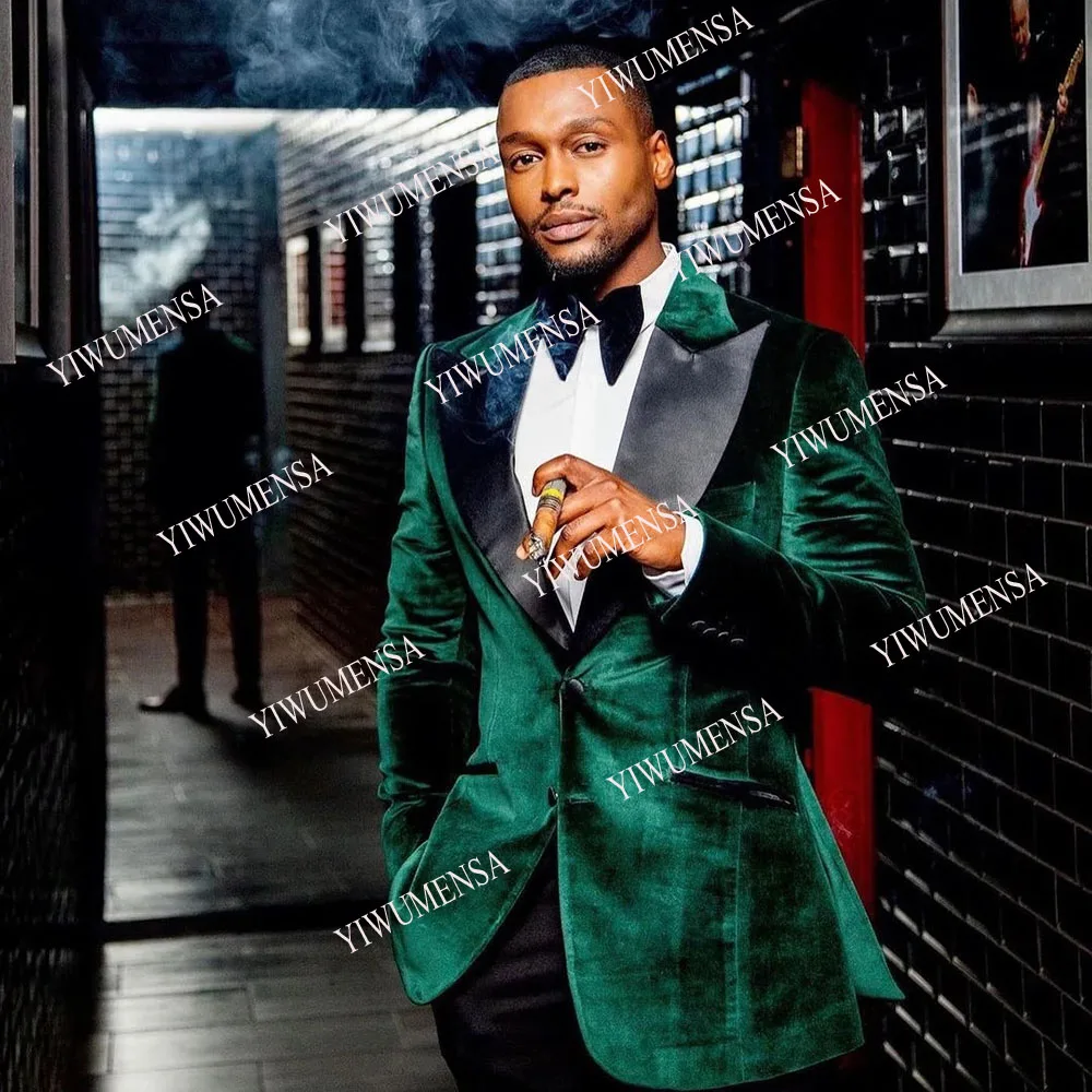 Весенне-осенние зеленые блейзеры YIWUMENSA, бархатные мужские костюмы, Мужская одежда для жениха, черная атласная куртка с заостренным лацканом, облегающее пальто, смокинг