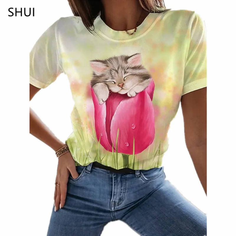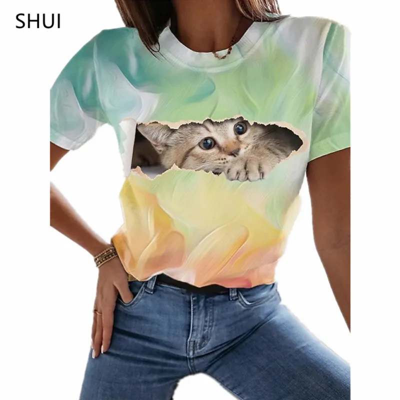 Модная Повседневная футболка с 3D-принтом кота, топ с круглым вырезом и короткими рукавами, забавная рубашка, новинка 2021, летняя женская музыкальная футболка, забавная одежда унисекс