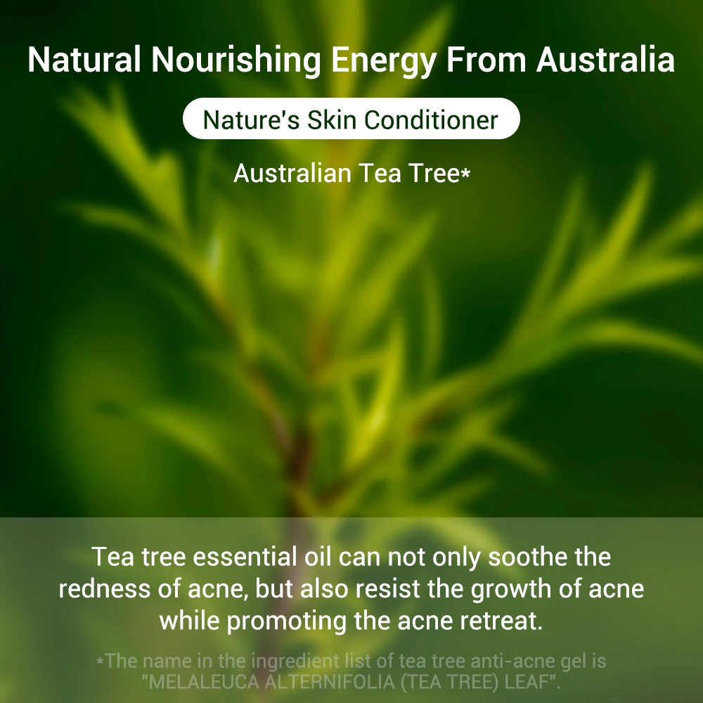 Натуральная питательная энергия из Австралии Кондиционер для кожи природы Австралийское чайное дерево * Эфирное масло чайного дерева может не только успокоить покраснение акне, но и противостоять росту акне, способствуя при этом отступлению акне. * Название в списке ингредиентов чайного дерева анти-гель от угрей "MELALEUCA ALTERNIFOLIA (чайное дерево) лист". Хамамелис натуральный вяжущий Подтягивает поры и восстанавливает вашу мягкую и гладкую кожу. Экстракт Hamamelis Mollis Oliver как натуральный уход за кожей, вяжущий и естественный враг грубых пор, обладает очищающим и вяжущим эффектом, при двойной очистке кожи. 01 очистить и затянуть Poresn | 02 регулировать секрецию масла Салициловая кислота попадает в корень акне Смягчает кератин кожи и стимулирует эффект от акне Спокойный и мягкий Прямо на нижнюю часть кожи, облегчает боль и успокаивает акне. Масло для контроля акне Очищает Масло, разблокирует забитые поры, снимает покраснения от акне и подавляет акне. Кондиционирование акне Устраняет новые и старые следы от акне, разглаживает кожу и способствует регенерации клеток.
