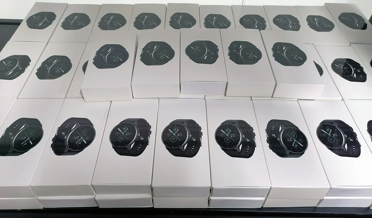 Умные часы, зарядное устройство, ремешок на запястье, руководство, коробка
