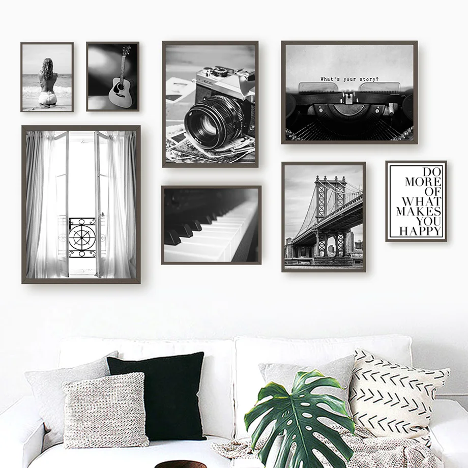 Черно-белая фотокамера гитара пианино сексуальная девушка настенная Картина на холсте скандинавские плакаты и принты настенные картины для декора гостиной
