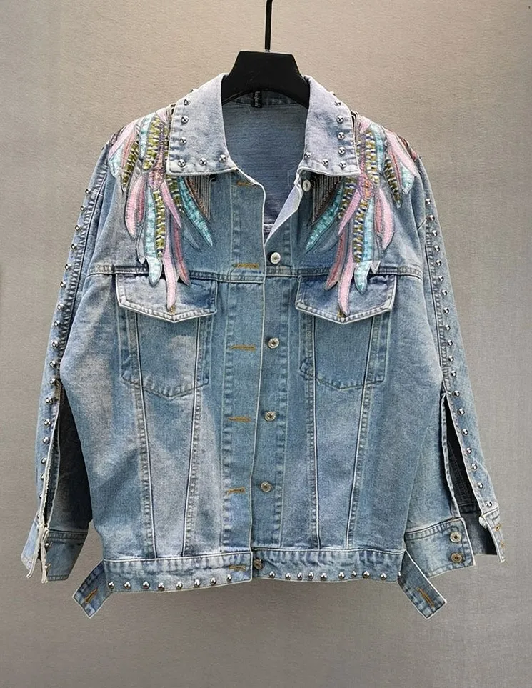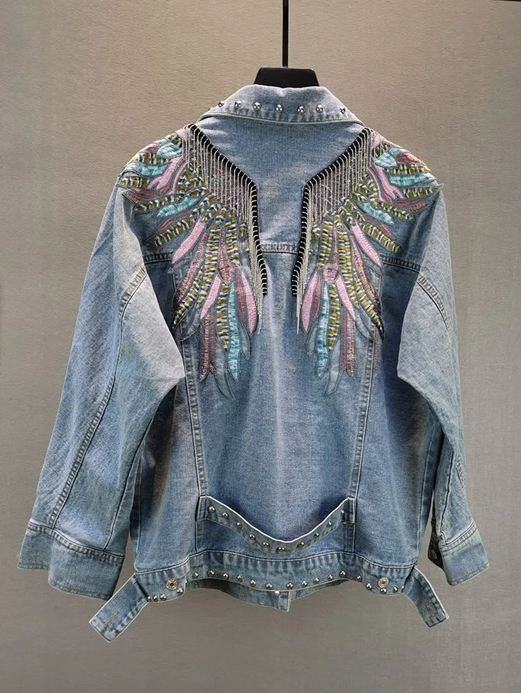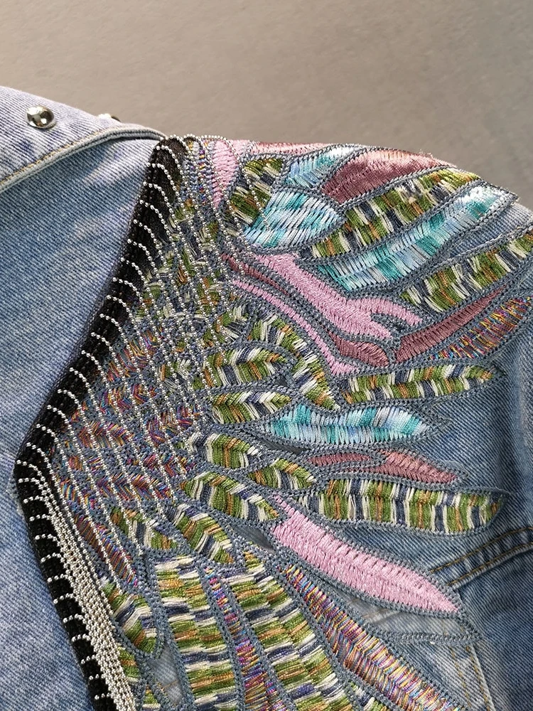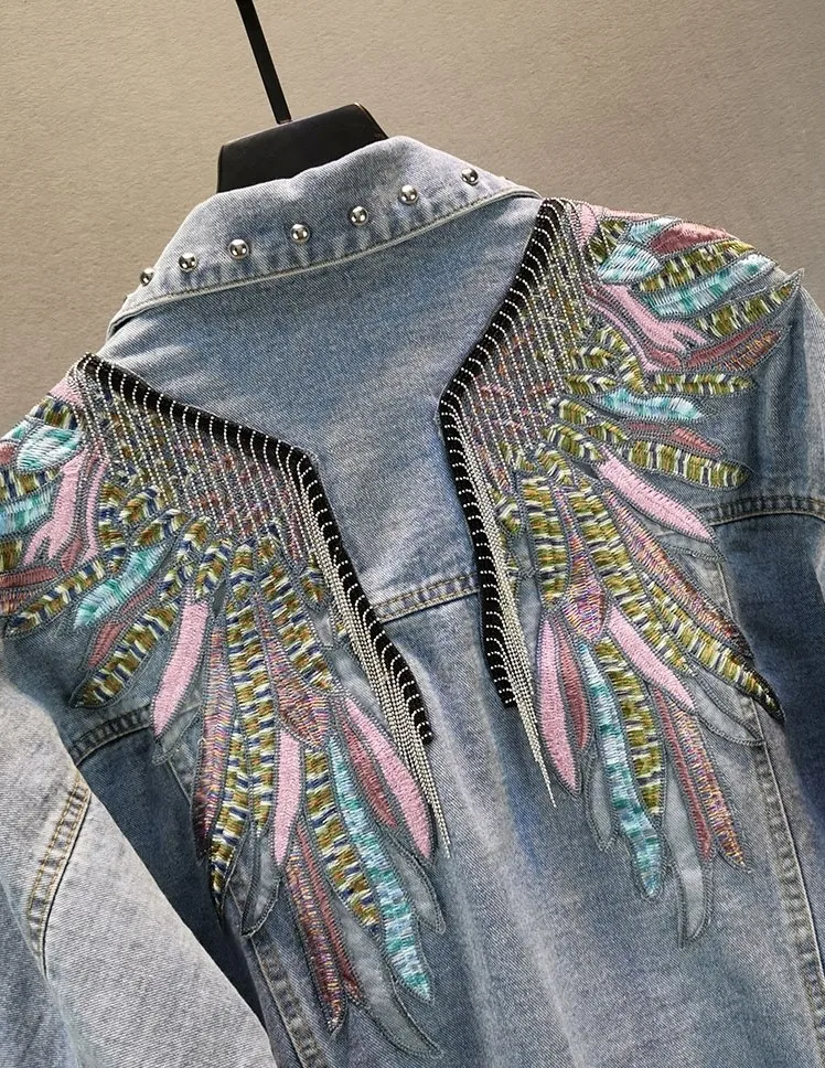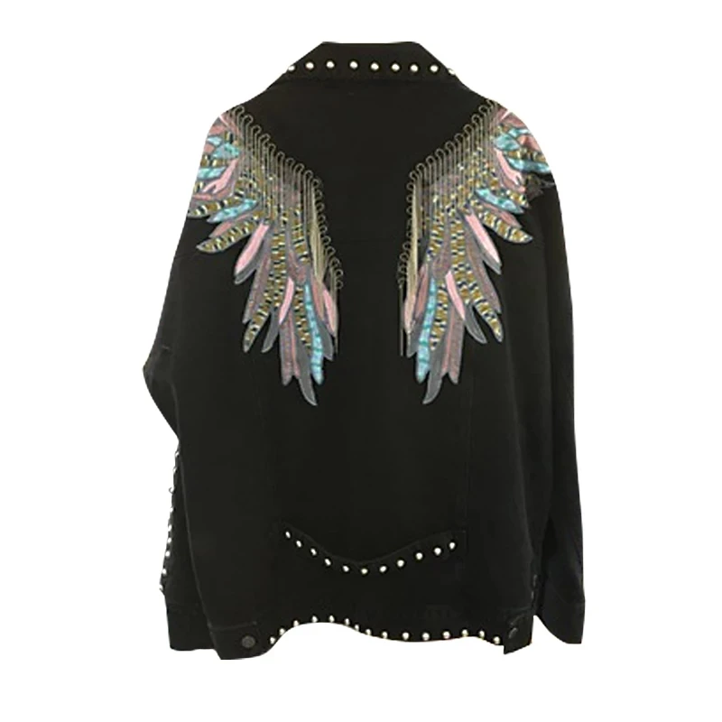 Женское джинсовое пальто DUISNENA с длинным рукавом, Осеннее Женское пальто, винтажное хлопковое пальто с бахромой и вышивкой крыльями в стиле хип-хоп, повседневное
