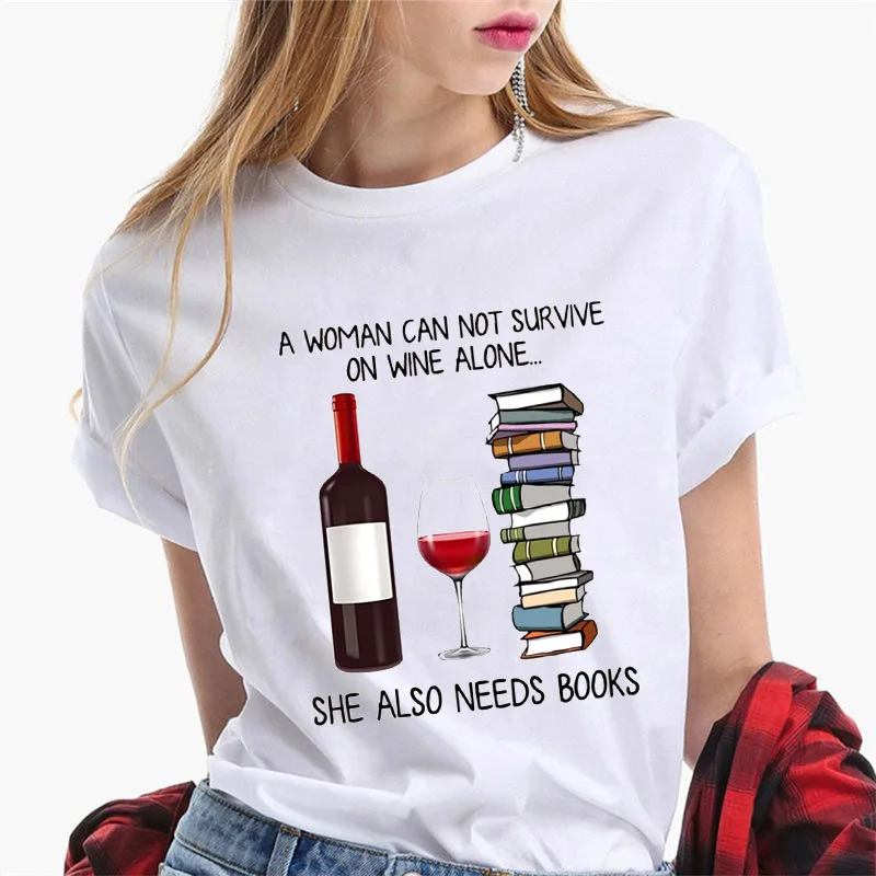 Женская футболка в стиле Харадзюку, женские футболки с принтом а женщина не может выжить на вине, одинокой, ей также нужны книги, футболка с принтом, футболка, одежда
