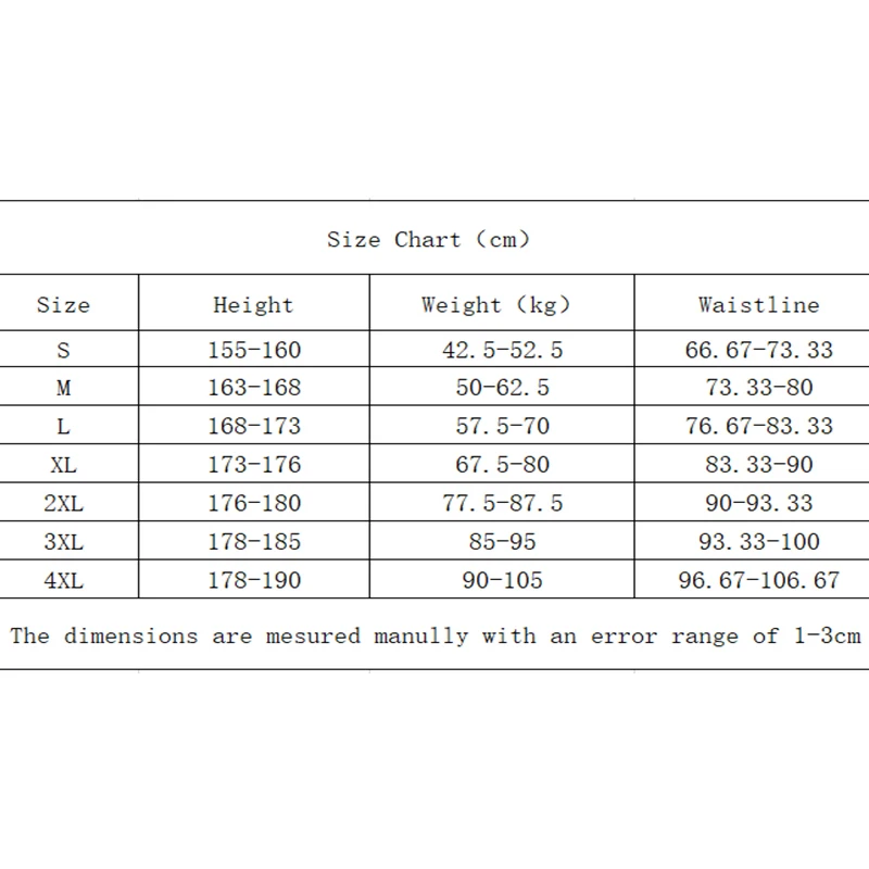 S: рост: 155-160 см; Вес: 42,5-52,5 кг; Талия: 66,67-73,33 см;M: Рост: 163-168 см; Вес: 50-62,5 кг; Талия: 73,33-80 см;L: Рост: 168-173 см; Вес: 57,5-70 кг; Талия: 76,67-83,33 см;XL: Рост: 173-176 см; Вес: 67,5-80 кг; Талия: 83,33-90 см;2XL: Рост: 176-180 см; Вес: 77,5-87,5 кг; Талия: 90-93,33 см;3XL: Рост: 178-185 см; Вес: 85-95 кг; Талия: 93,33-100 см;4XL: Рост: 178-190 см; Вес: 90-105 кг; Талия: 96,67-106,67 см;