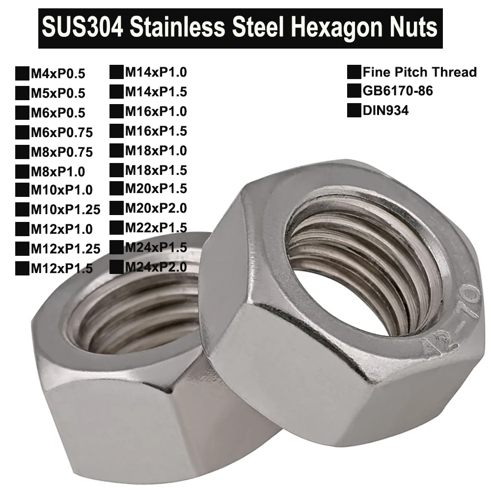 SUS304 шестигранные гайки из нержавеющей стали тонкая резьба M4 M5 M6 M8 M10 M14 M16 M18 M20 M22 M24