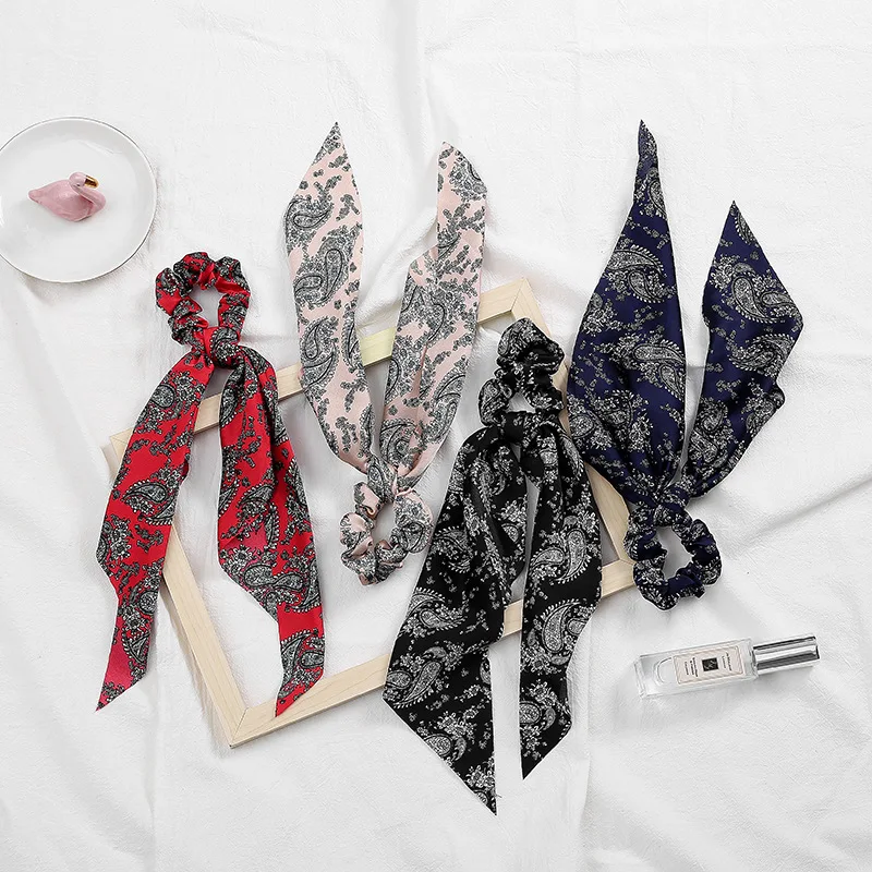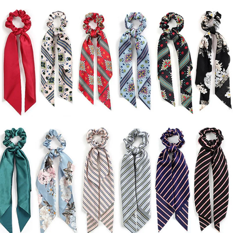 Женская атласная резинка для волос, Длинная лента с бантом и принтом, аксессуар для волос, 2021