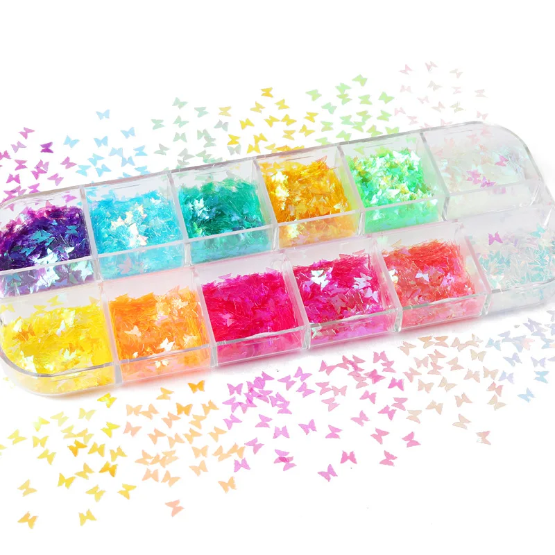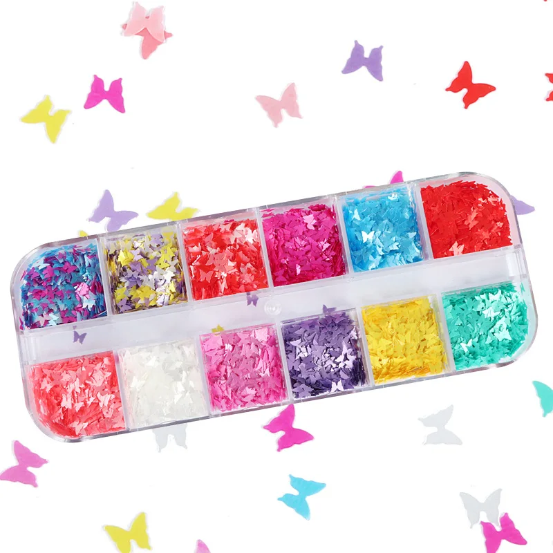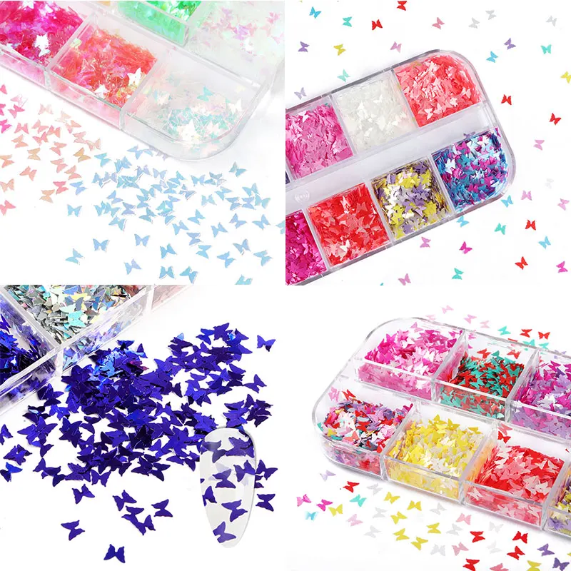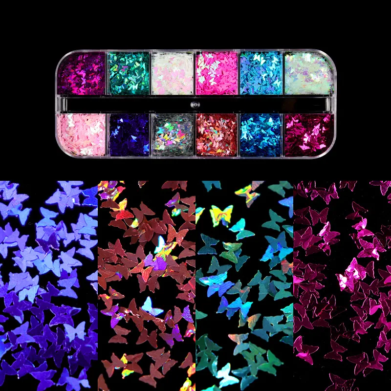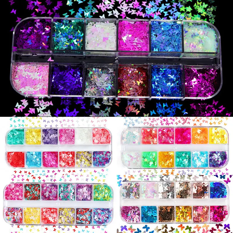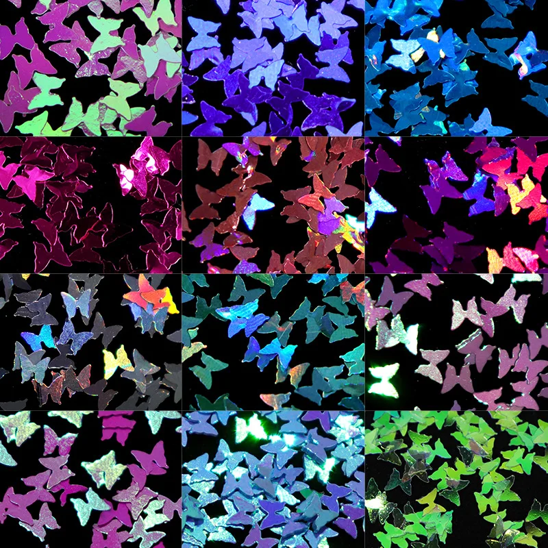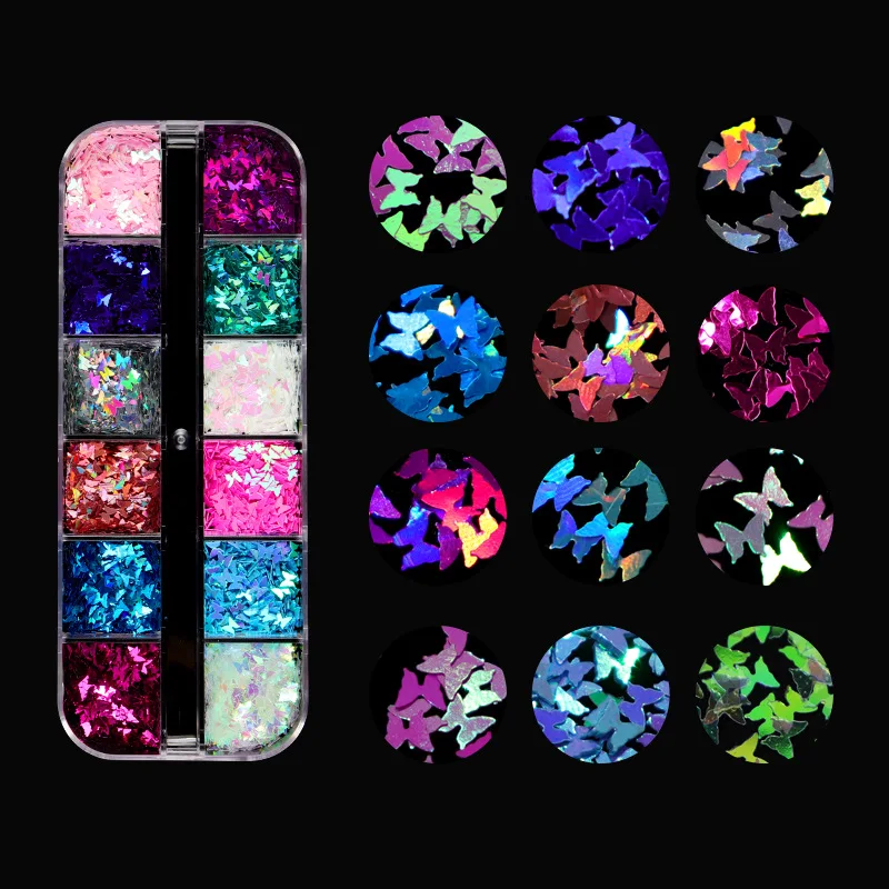 Лазерные ломтики ногтей блестки 3D фимо хлопья 12 балок разноцветные наклейки на ногти бабочки самодельные Украшения для ногтей