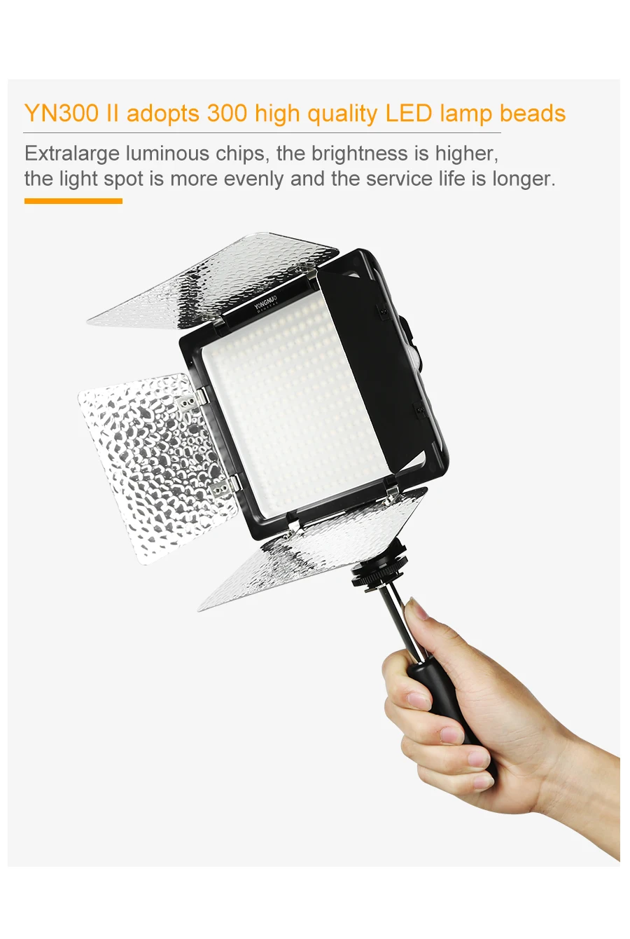 YN300-II принимает 300 высококачественных светодиодный светильник с бусинами сверхбольших световых чипов, яркость выше, светильник более равномерно и срок службы больше.