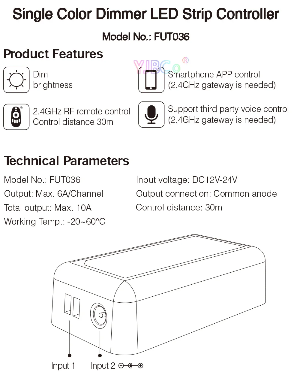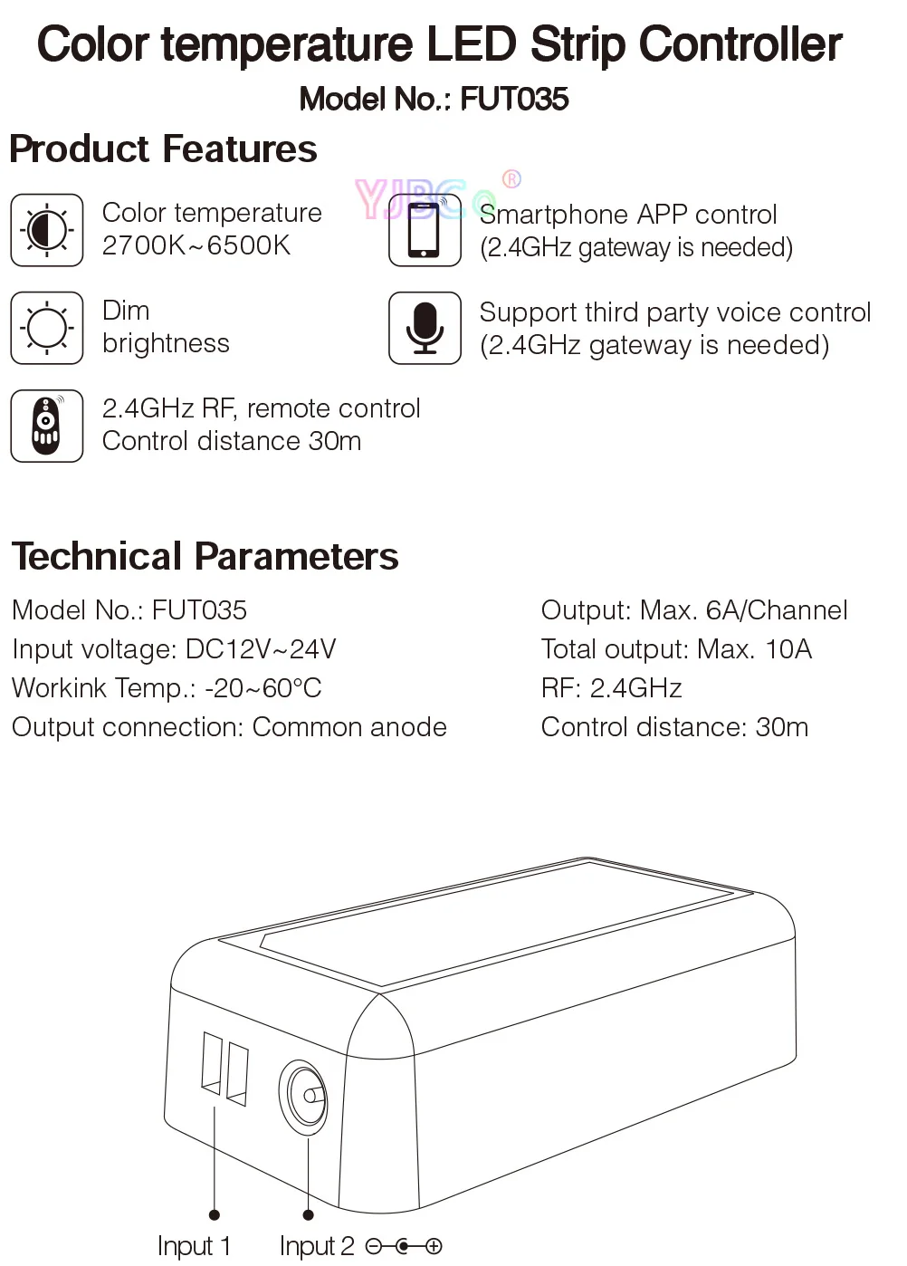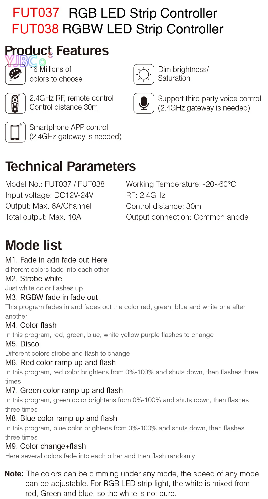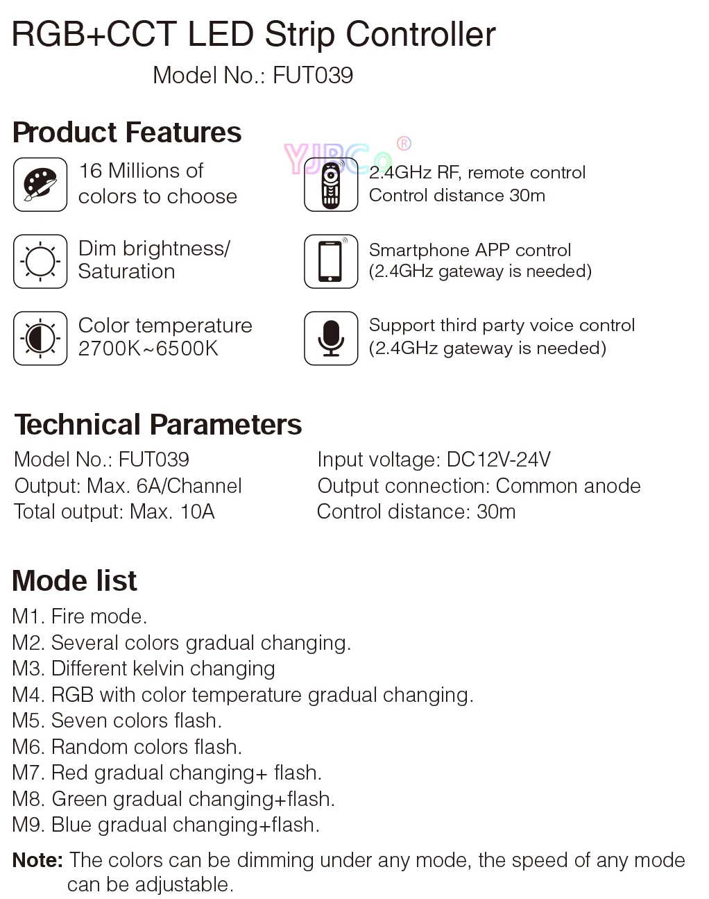 Название продукта:2,4 ГГц светодиодный одинарный Цвет диммерНомер модели:FUT036Напряжение: DC12V-24VВыход: Макс. 6А/каналОбщая выходная мощность макс: 10ARF: 2,4 ГГцРасстояние управления: 30 мВыходное соединение: общий анодНазвание продукта:2,4 ГГц Цвет Температура Светодиодные ленты контроллерНомер модели:FUT035Напряжение: DC12V ~ 24VВыход: Макс. 6А/каналОбщая выходная мощность макс: 10ARF: 2,4 ГГцРасстояние управления: 30 мВыходное соединение: общий анодНазвание продукта:2,4 ГГц RGB Светодиодные ленты контроллерНомер модели:FUT037Напряжение: DC12V-24VВыход: Макс. 6А/каналОбщая выходная мощность макс: 10AРасстояние управления: 30 мRF: 2,4 ГГцВыходное соединение: общий анодНазвание продукта:2,4 ГГц RGBW Светодиодные ленты контроллерНомер модели:FUT038Напряжение: DC12V-24VВыход: Макс. 6А/каналОбщая выходная мощность макс: 10AРасстояние управления: 30 мRF: 2,4 ГГцВыходное соединение: общий анодНазвание продукта:2,4 GHz RGB + CCT контроллер полосыНомер модели:FUT039Напряжение: DC12V-24VВыход: Макс. 6А/каналОбщая выходная мощность макс. 10AВыходное соединение: общий анодРасстояние управления: 30 мРазмер: 85*45*22,5 мм