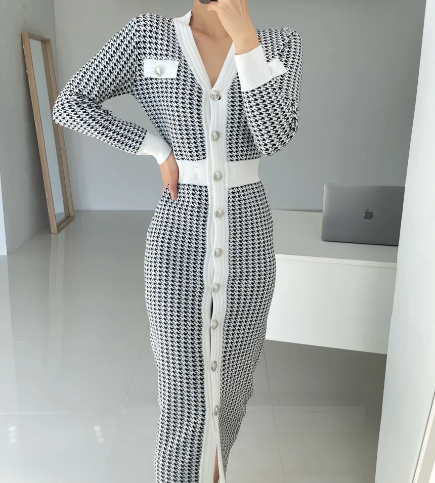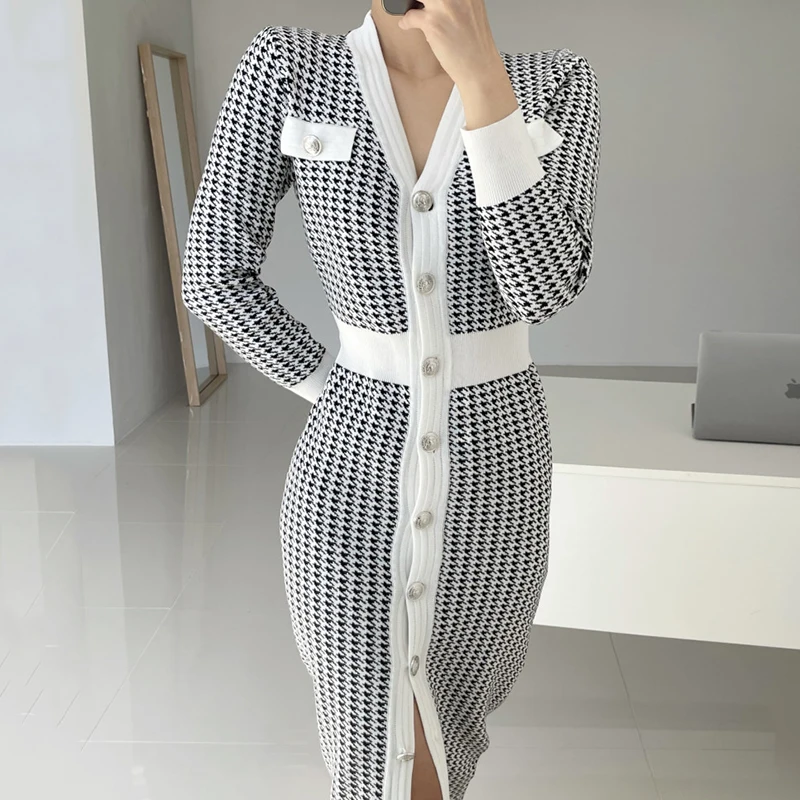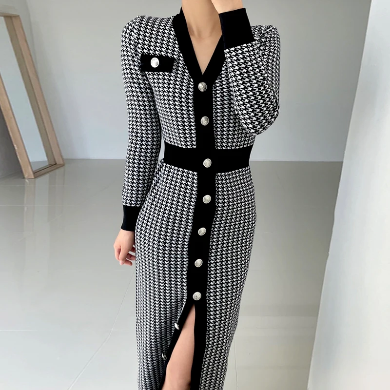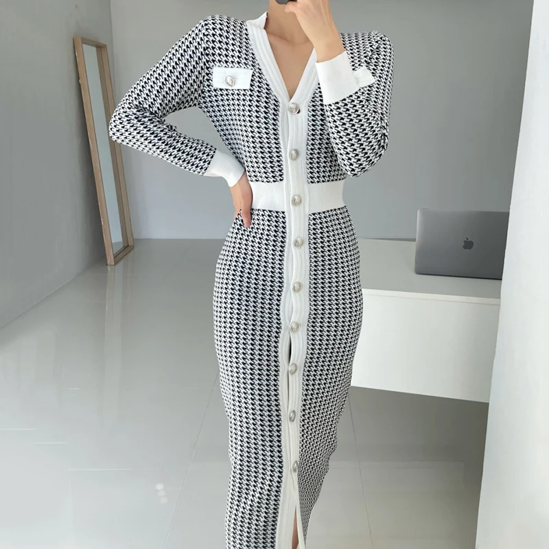 Однобортное женское платье-джемпер, платье-свитер в клетку, женское вязаное плотное теплое однотонное платье-свитер в Корейском стиле на осень и зиму 2021