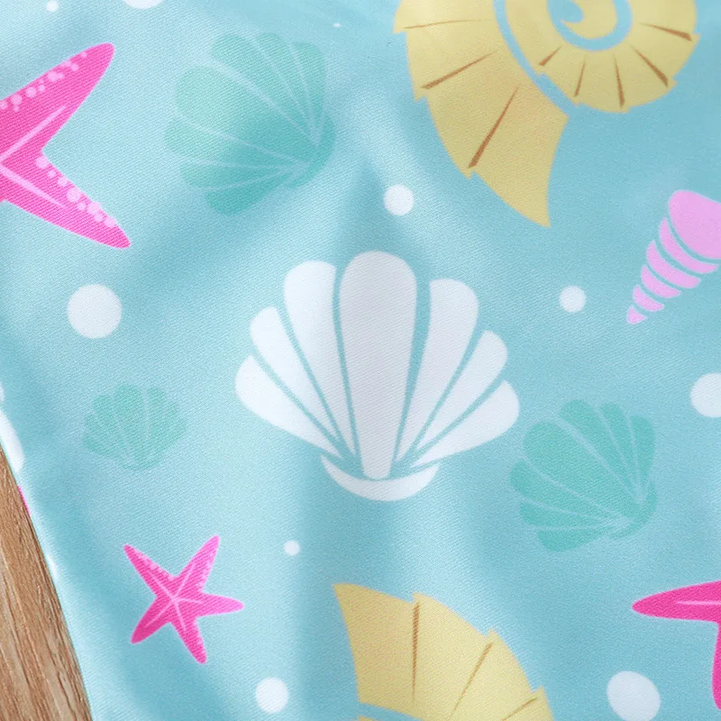 Слитный купальник для девочек, с принтом ракушек, с летящим рукавом, с бантом, головной убор, 2021