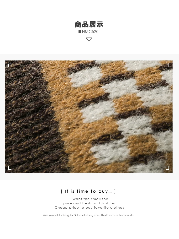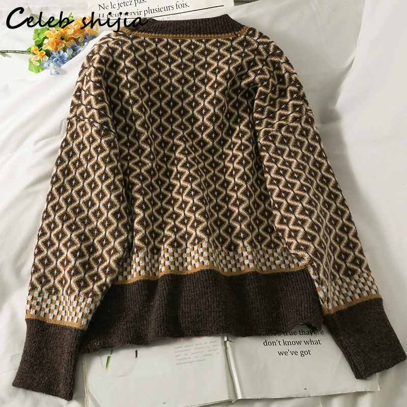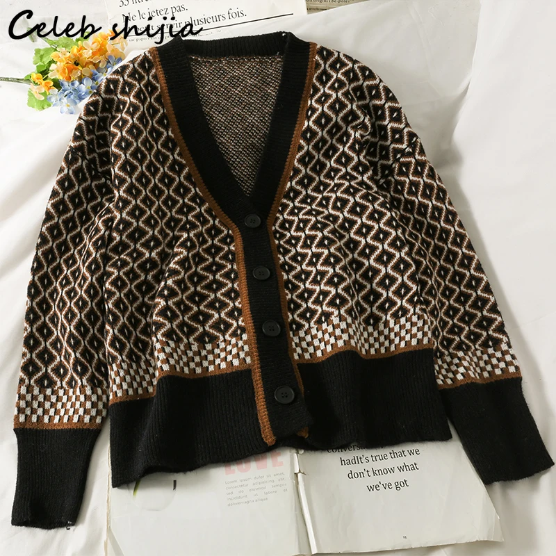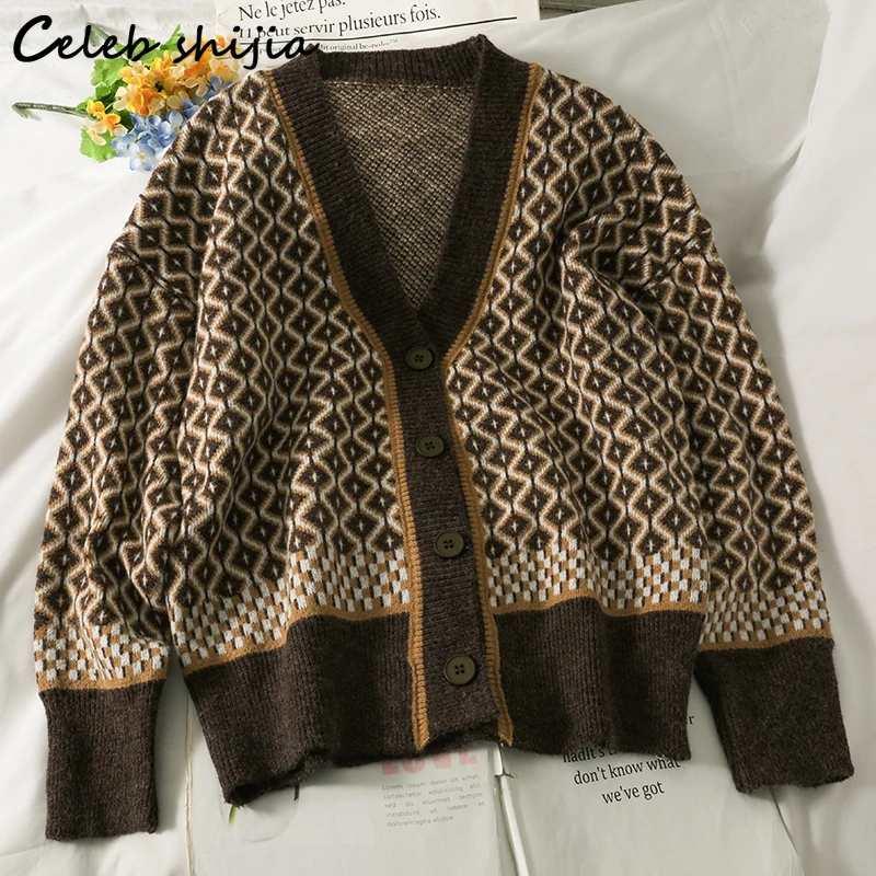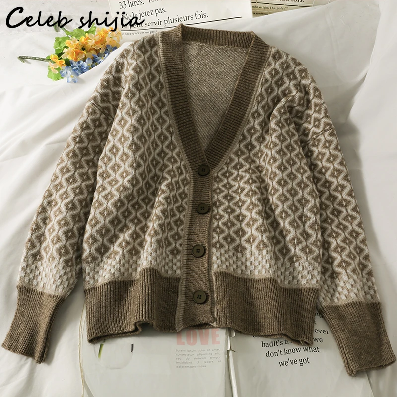 Женский шерстяной однобортный Кардиган, винтажный вязаный кофейный клетчатый свитер в стиле преппи с V-образным вырезом, осень 2021