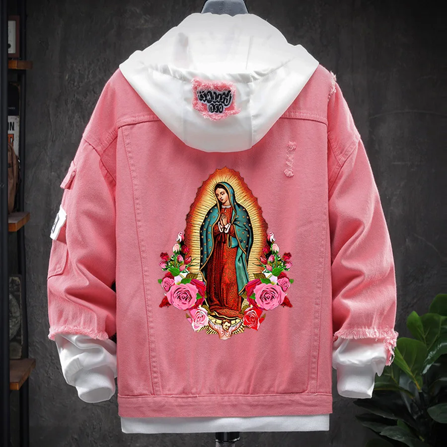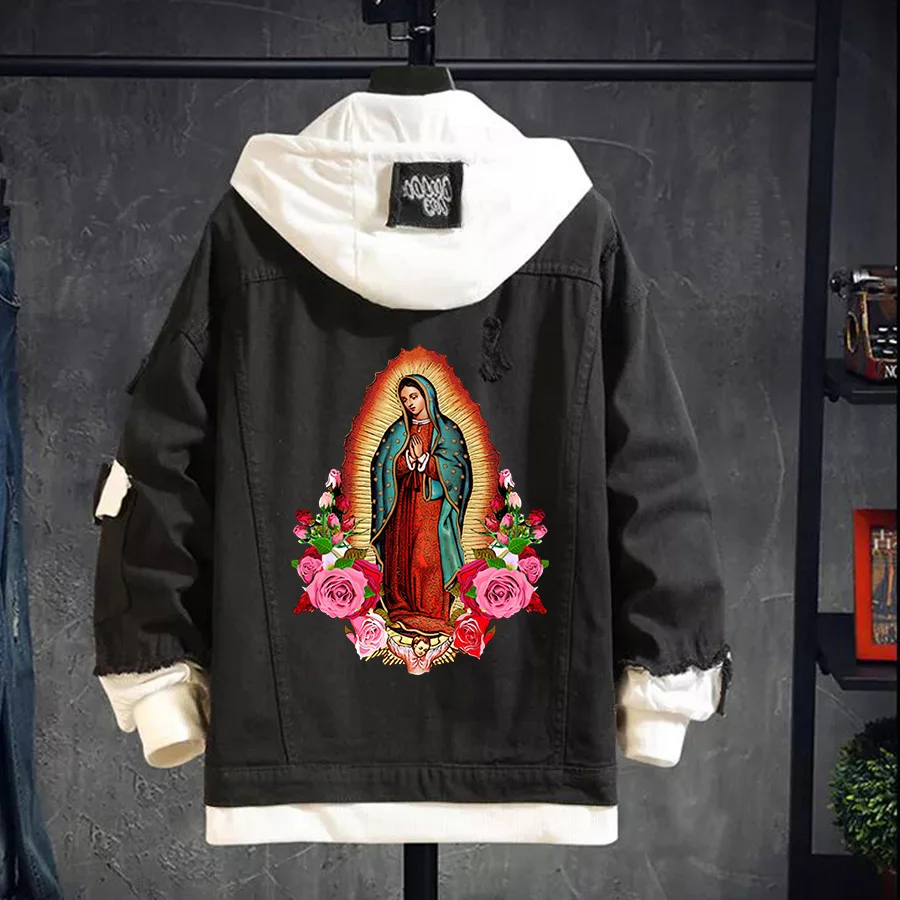 Куртка мужская джинсовая Дева Мария гуадель, осенняя, винтажная, Черная
