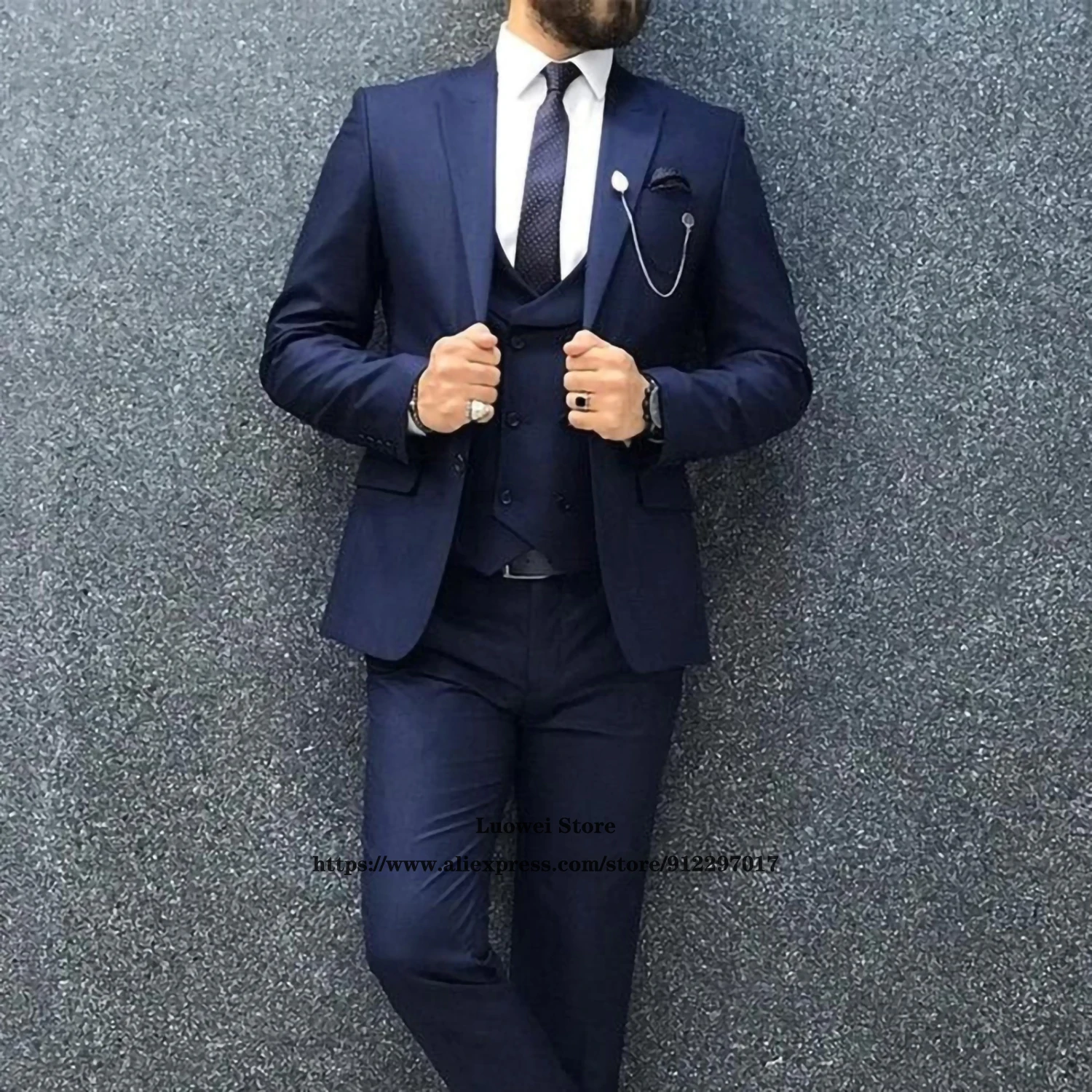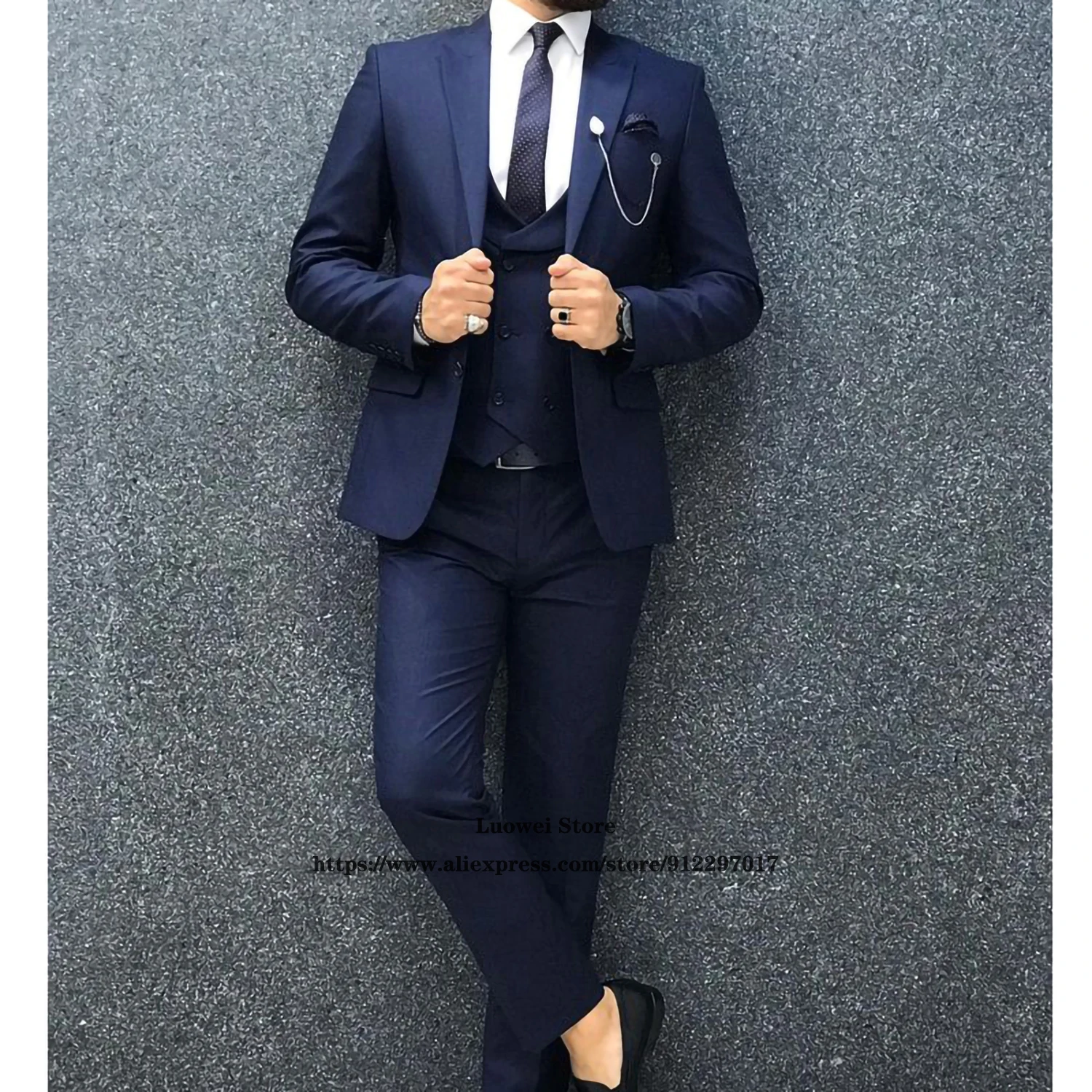 Классические Темно-Синие Деловые облегающие мужские костюмы из 3 пр...
