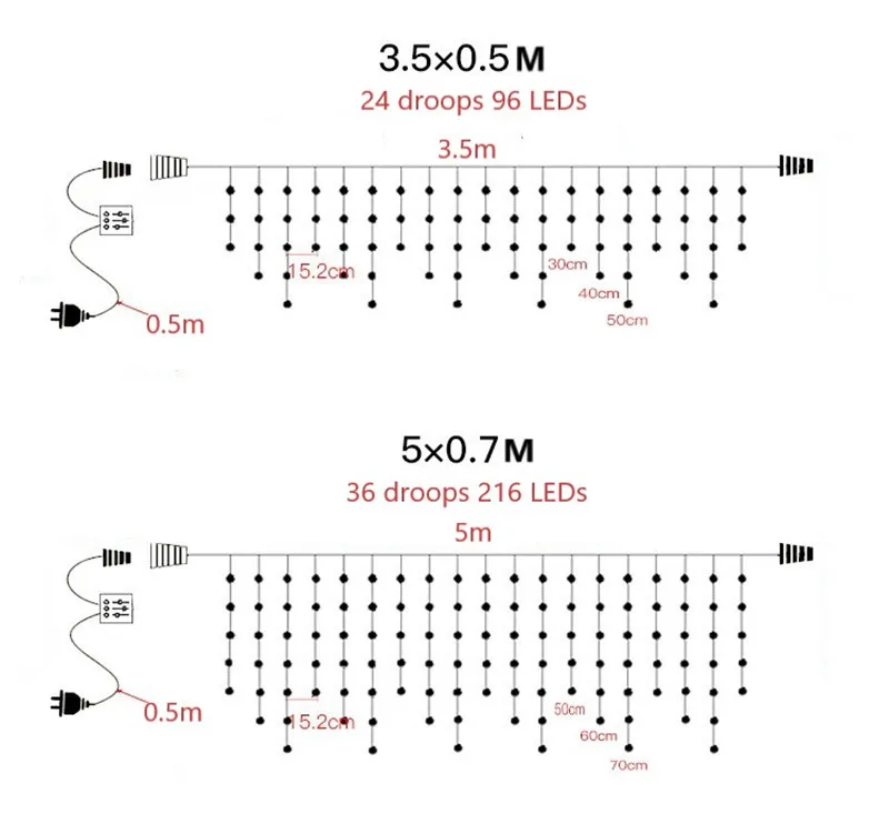 1, 3,5 м x 0,5 м сосулька струнные огни; 3,5 м на ширину и 0,3 м/0,4 м/0,5 м на высоту, все имеет 24 капель всего 96 светодиодов. От штекера до хвоста разъем 4,5 метр.2. 5 м x 0,7 м гирлянда из светодиодной ленты: 5 метров по ширине и 0,5 м/0,6 м/0,7 м, визуально увеличивающие рост, все, что имеет 36 отвисает всего 216 светодиодов. От штекера до хвостового соединителя 6 метров.