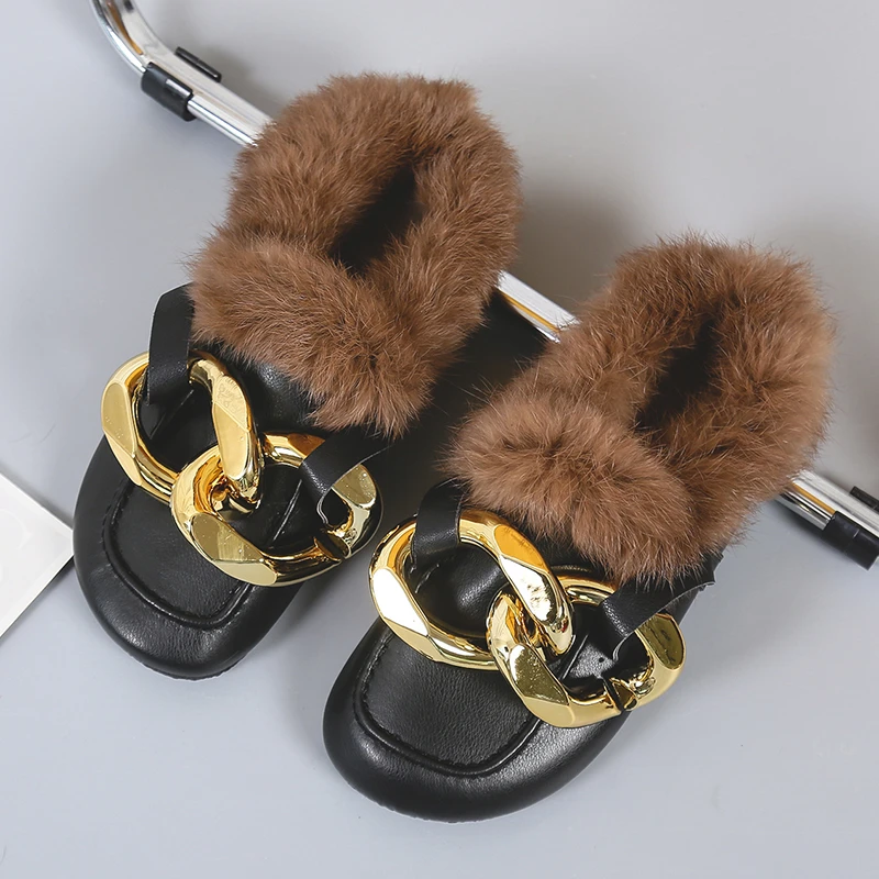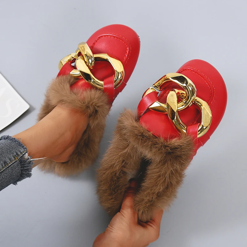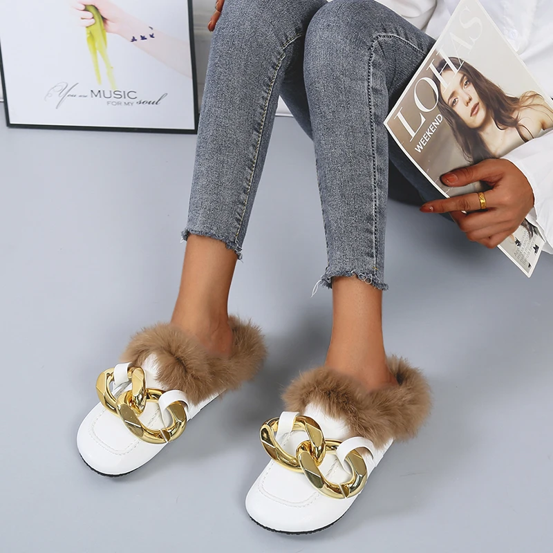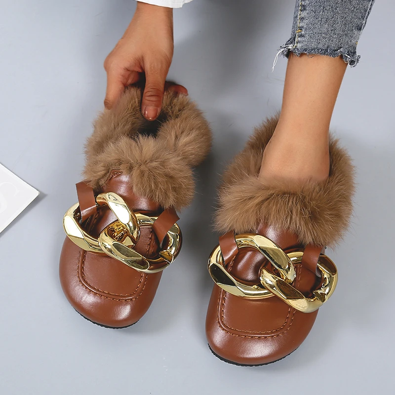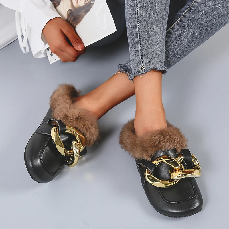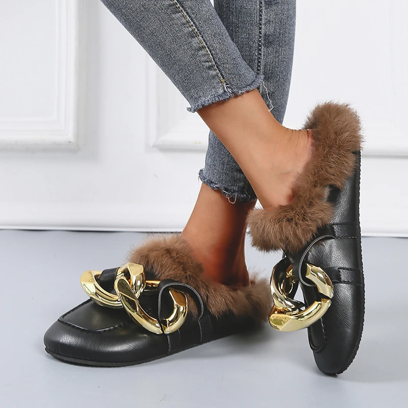 Женские туфли на натуральном меху LazySeal, повседневные Мокасины с металлической цепочкой, круглый носок, пушистые шлепанцы, пушистые шлепанцы, обувь для осени