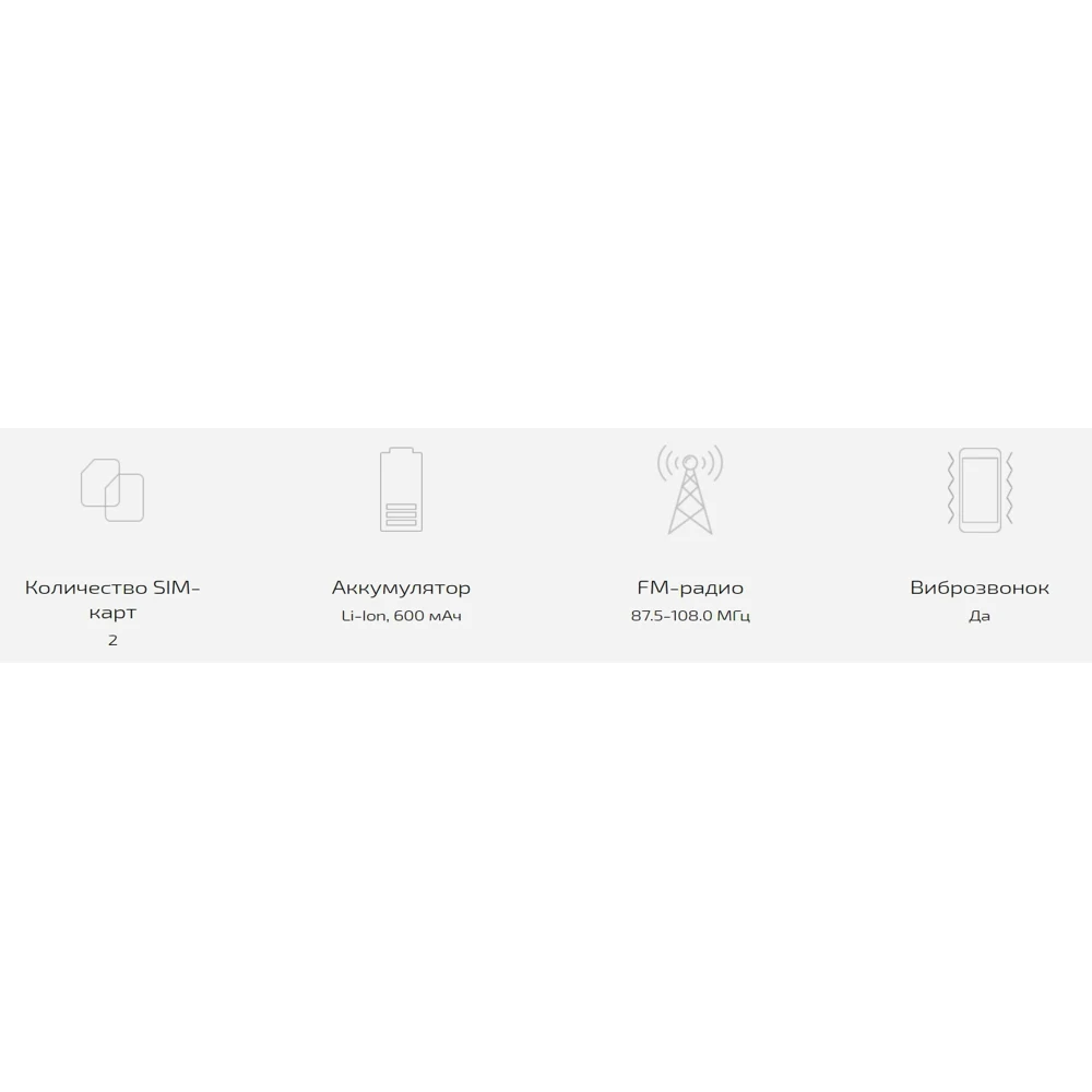 GSM 850/900/1800/1900. Поддержка 2 SIM карт. Дисплей 1,77”, 128x160. Аккумулятор Li ion, 600 мАч. Виброзвонок. Аудио/видео плеер. FM радио. Фонарик. Интерфейс microUSB. Слот microSD/microSDHC (до 16 ГБ). Размеры 111.5 х48 х14 мм. Вес 63.3 г.Техническое описаниеДисплей: 1,77”, 128x160Стандарт связи: GSM 850/900/1800/1900Количество SIM-карт: 2Виброзвонок: ДаВстроенный аудио/видео плеер: ДаАккумулятор: Li-ion, 600 мАчFM-радио: 87.5-108.0 МГцИнтерфейс: microUSBСлот расширения: microSD/microSDHC (до 16 ГБ)Размеры: 111.5 х48 х14 ммВес: 63.3 г