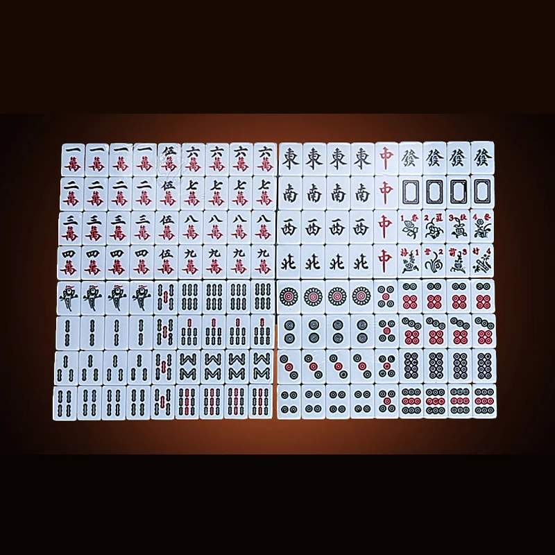 -144 плитки включают 36 кругов, 36 бамбуков, 36 символов, 12 драконов (красный, зеленый, белый), 16 Ветров (Северный, Восточный, задний, западный), 8 цветов и сезонов.
