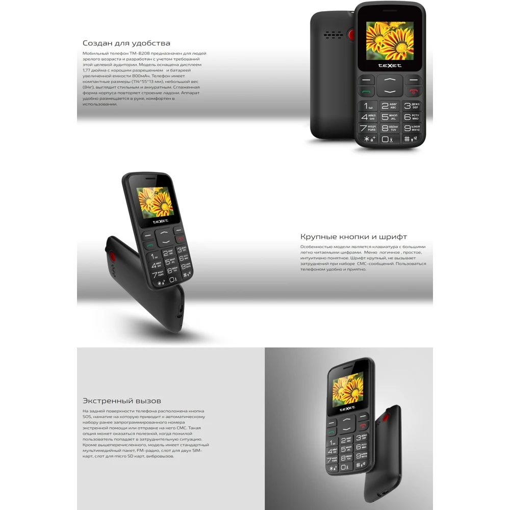 Мобильный телефон TM-B208 предназначен для людей зрелого возраста и разработан с учетом требований этой целевой аудитории.Техническое описаниеДисплей: 1.77", 160x128Кнопка SOS: ДаТелефонная книга: 300Количество SIM-карт: 2Виброзвонок: ДаФонарик: ДаFM-радио: 87.5-108.0 МГцBluetooth: ДаАккумулятор: Li-Ion, 800 мАчИнтерфейс: microUSB, аудио 3.5 mmСлот расширения: microSD/SDHC (до 32 Гб)Размеры: 114*55*13 ммМасса: 84 гСтандарт связи: GSM 900/1800Текстовые сообщения (SMS): ДаВстроенный аудио/видео плеер:Да