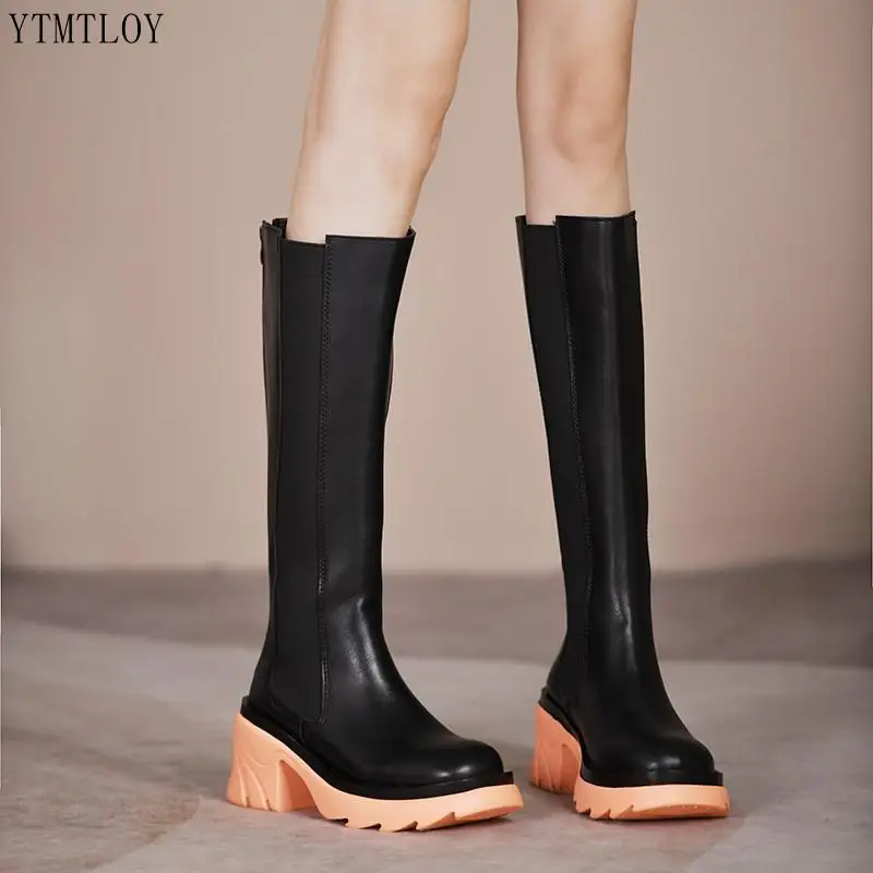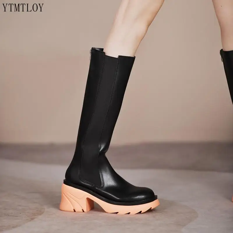 Женские сапоги до колена на массивном каблуке, зимние сапоги из натуральной кожи с круглым носком, 2022