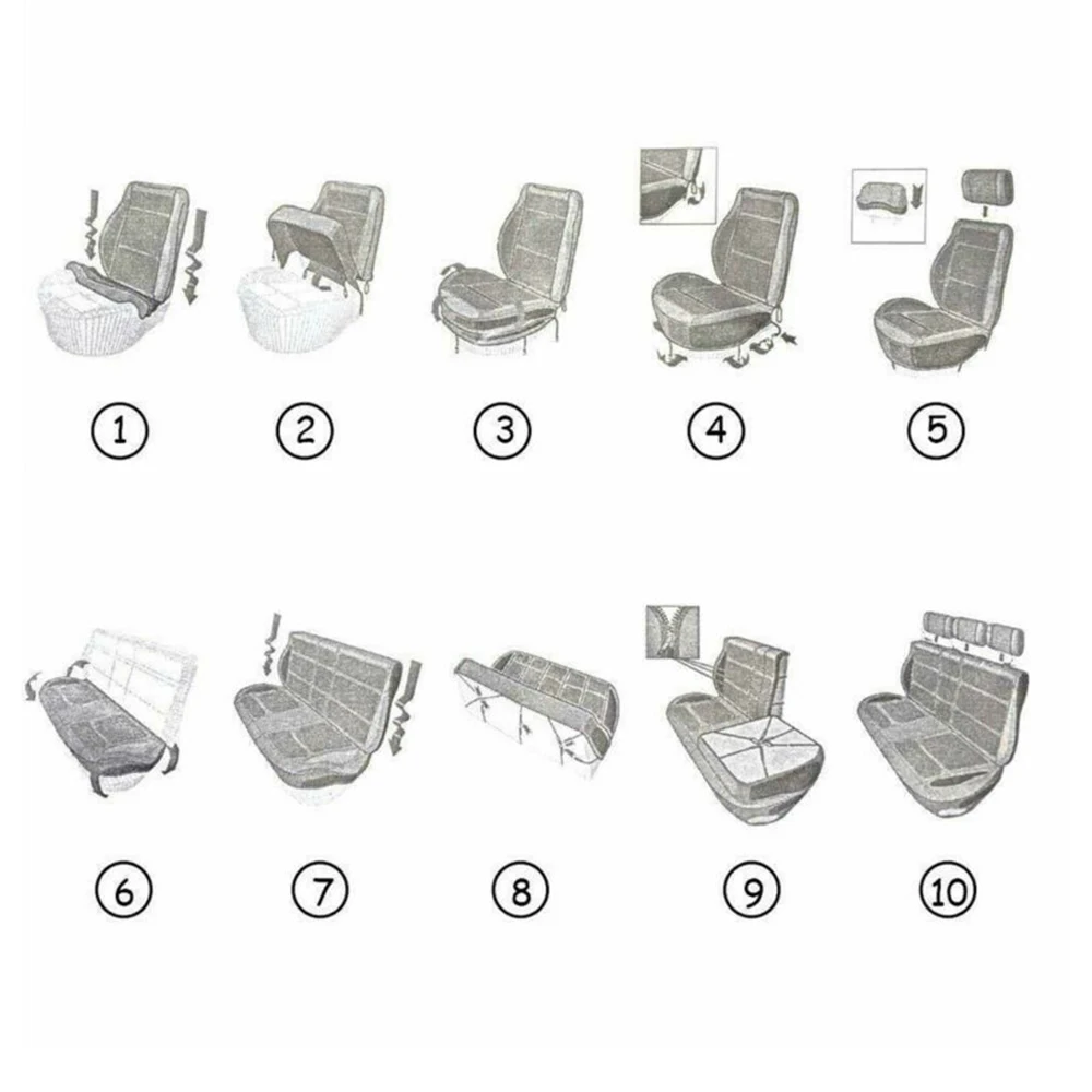 2 * Чехол на переднее сиденье, 1 * чехол на заднее сиденье, 1 * спинка, 5 * Чехол на подголовник + аксессуары (Руководство по эксплуатации, 1 пакет крючков)