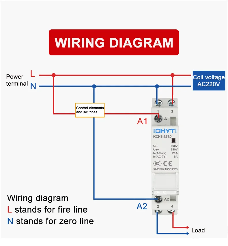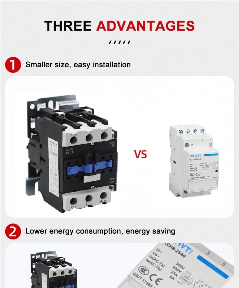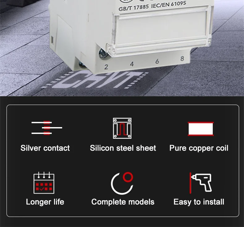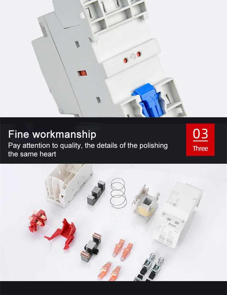 AC контактор для дома-это в основном предназначены для переменного тока 50 Гц или 60 Гц цепей с 230/400V. Номинальное рабочее напряжение при AC-7a использовании, Номинальное рабочее напряжение до 230 В, номинальный рабочий ток до 63А, Номинальное рабочее напряжение в использовании AC-7b, номинальный ток до 20А. Использование в разрыве мощности ниже 6kA цепи. Для расстояния подключения или прерывания цепи.Применение: для дома, квартиры, отеля, автоматическое отключение или подключение питания.Нормальные условия работы и установки:1. Температура окружающей среды: от-5 °C до + 40 °C, средняя температура не более + 35 °C в течение 24 часов.2. Высота: не более 2000 м.3. Атмосферные условия: относительная влажность места установки должна быть не более 50%, когда максимальная температура + 40 °C: Если при более низкой температуре допускается более высокая относительная влажность. Среднемесячная минимальная температура в Самый влажный месяц не должна превышать + 25 °C и среднемесячная максимальная относительная влажность в этом месяце не более 90%. Кроме того, следует учитывать росы на поверхности продуктов, вызванные изменением температуры.4. Класс загрязнения: класс 2.5. Условия установки: класс II.Инструкция по применению1. Проверьте, соответствует ли контактор объему применения и условиям работы перед установкой2. Во время установки выньте компонент остановки движения и поставьте контактор на безопасную орбиту, а затем Поднимите компонент остановки движения, чтобы зафиксировать контактор на безопасной орбите, чтобы избежать ослабления и падения компонент остановки движения, если вы хотите удалить контактор.ПредостережениеA) убедитесь в правильном режиме подключенияB). Закрутите винт во время соединения