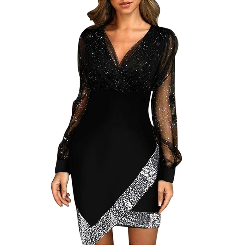 Элегантное женское платье с длинным рукавом и высокой талией, асимметричное сексуальное блестящее Сетчатое лоскутное облегающее платье с V-образным вырезом, модная одежда для выпусквечерние вечера
