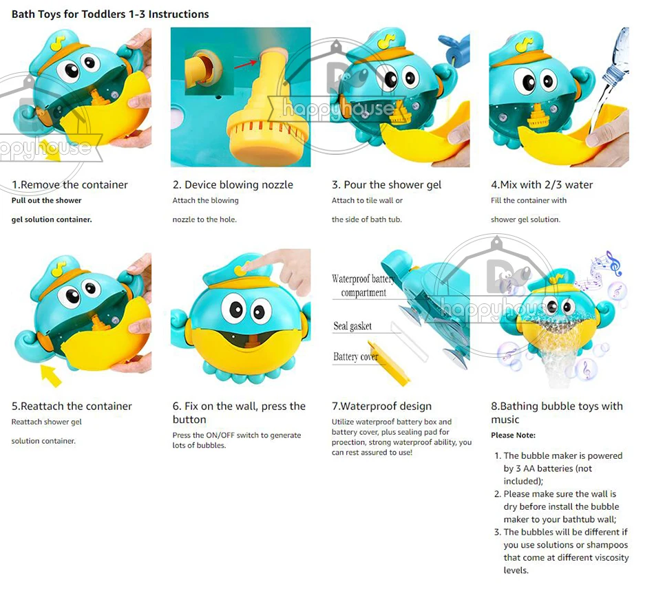 Простота в эксплуатации --- может быть прочно закреплена в ванной или на стене ванной комнаты с 3 чашками для сукций в задней части мыльной пузырчатой машины. Просто налейте раствор в резервуар, нажимая кнопку, чтобы обеспечить устойчивый поток пузырьков. Питание от 2 батарей AA (Батарейки в комплект не входят).