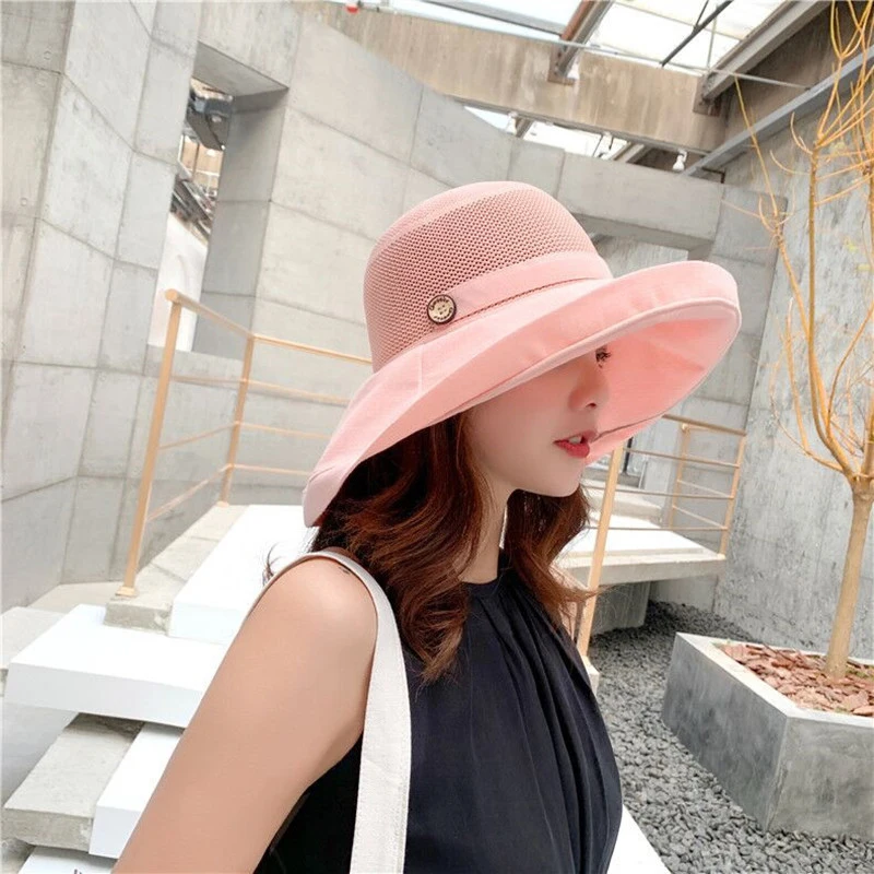 Женская пляжная шляпа, складная, с широкими полями, сетка однотонная сетчатая, дышащая, для защиты от солнца, для лета, шапка, защищающая от УФ-излучения