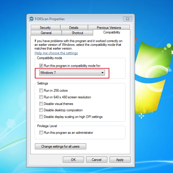 Решение:Шаг 1: Щелкните правой кнопкой мыши значок FORScan на рабочем столе, выберите «Свойства», выберите «Совместимость», Choo «Windows7», затем сохраните.Шаг 2: Щелкните правой кнопкой на значке FORScan, выберите «Run as administrator», подключите кабель к автомобилю и ноутбуку, включите зажигание для проверки.