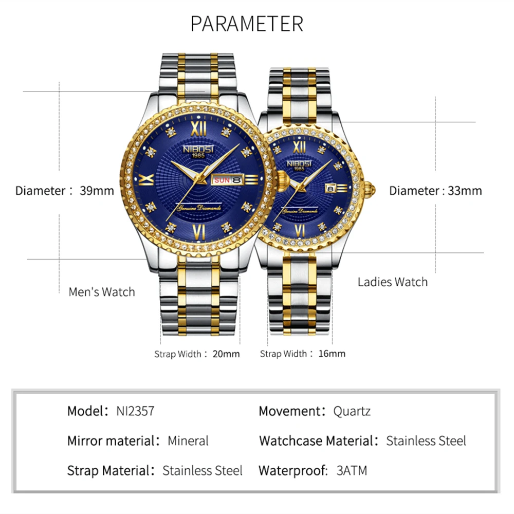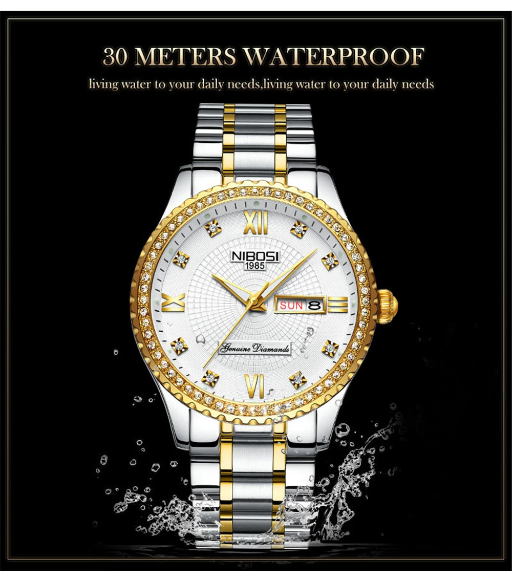 Часы наручные NIBOSI парные, брендовые Роскошные Кварцевые золотист...