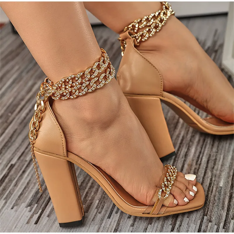 Сандалии женские на высоком каблуке, босоножки с цепочкой и кристаллами, открытый носок, ремешок с пряжкой, модная обувь, 2021