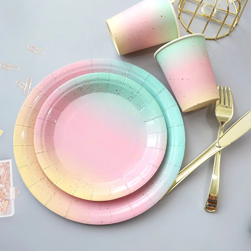 Посуда на день рождения, радужная бумажная тарелка, тарелка для торта, одноразовая посуда, цветная круглая тарелка, бумажная чашка, посуда, украшение вечерние НКИ