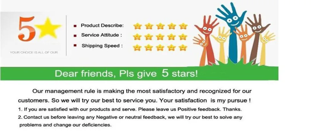 1: Если вы удовлетворены нашими товарами, пожалуйста, дайте нам положительный отзывы, Спасибо за помощь.2: Если вы не удовлетворены, пожалуйста, дайте нам знать. Ваш конструктивный Совет будет нашим предложением по переработке и улучшению, спасибо за понимание.3: Мы ответим вам в течение 24 часов. Уважаемый покупатель, Спасибо за вашу постоянную поддержку нашего магазина, и мы стремимся улучшить себя с точки зрения обслуживания, качества, поиска и т. Д. Мы будем очень признательны, если вы оставите нам положительные отзывы, что будет большим подспорьем для нас. Если я чем-то могу помочь, не стесняйтесь сказать мне. С наилучшими пожеланиями