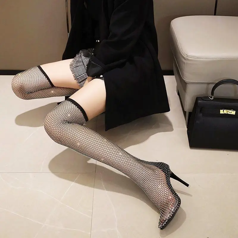Стразы Сетчатые эластичные сапоги выше колена высокие сапоги в сето...