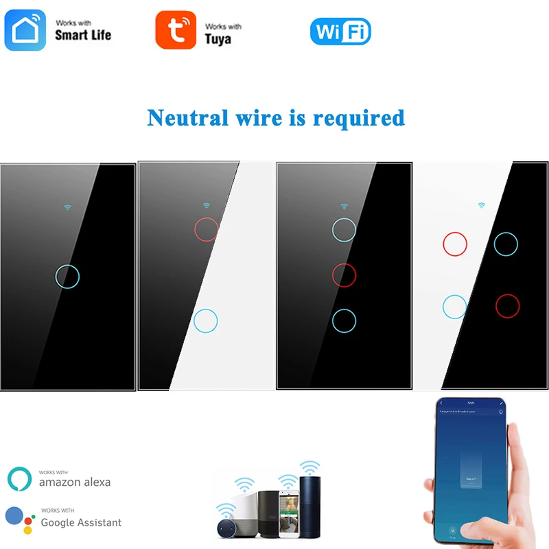 Умный выключатель света с Wi-Fi, сенсорная панель, голосовое управление, беспроводные настенные выключатели, работает с Alexa Google Home, 4 клавишами, американский и бразильский стандарт